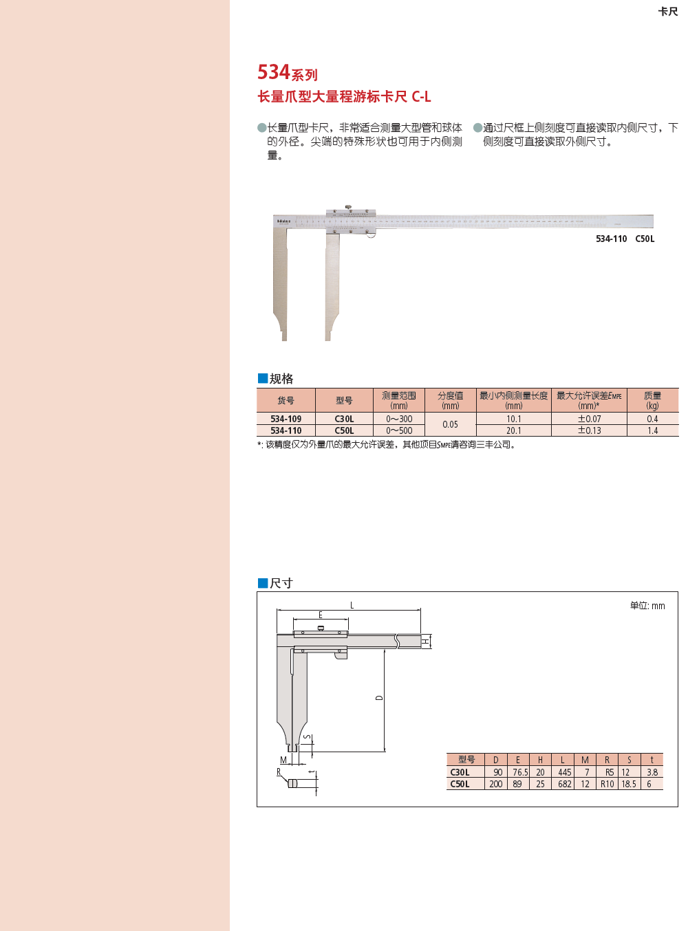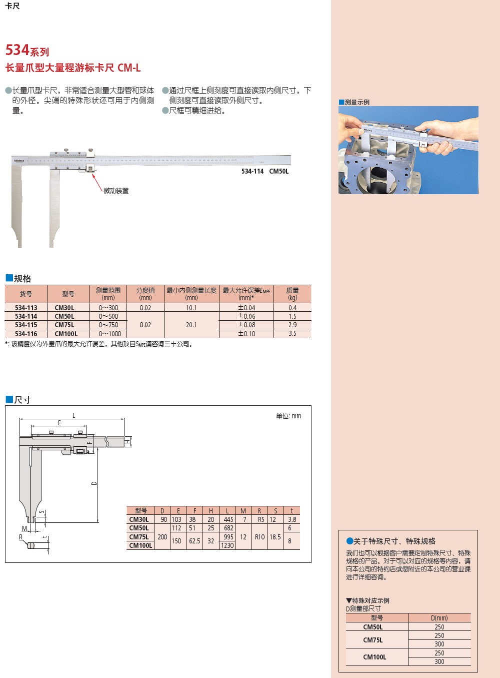 ●长量爪型卡尺,非常适合测量大型管和球体的外径。尖端的特殊形状也可用于内侧测量。