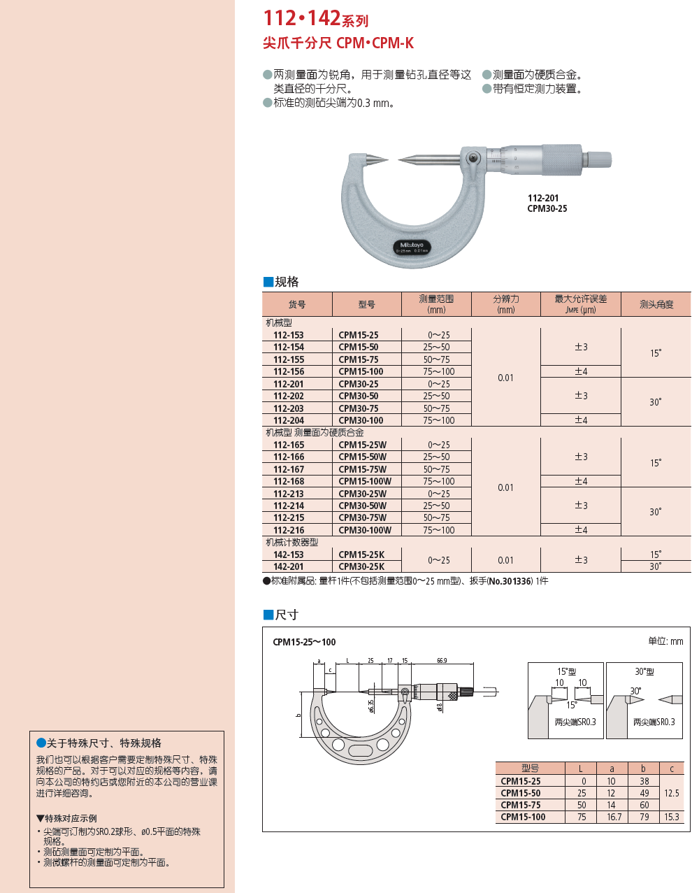 三丰mitutoyo尖头千分尺112-153螺纹底径千分尺螺纹小径千分尺