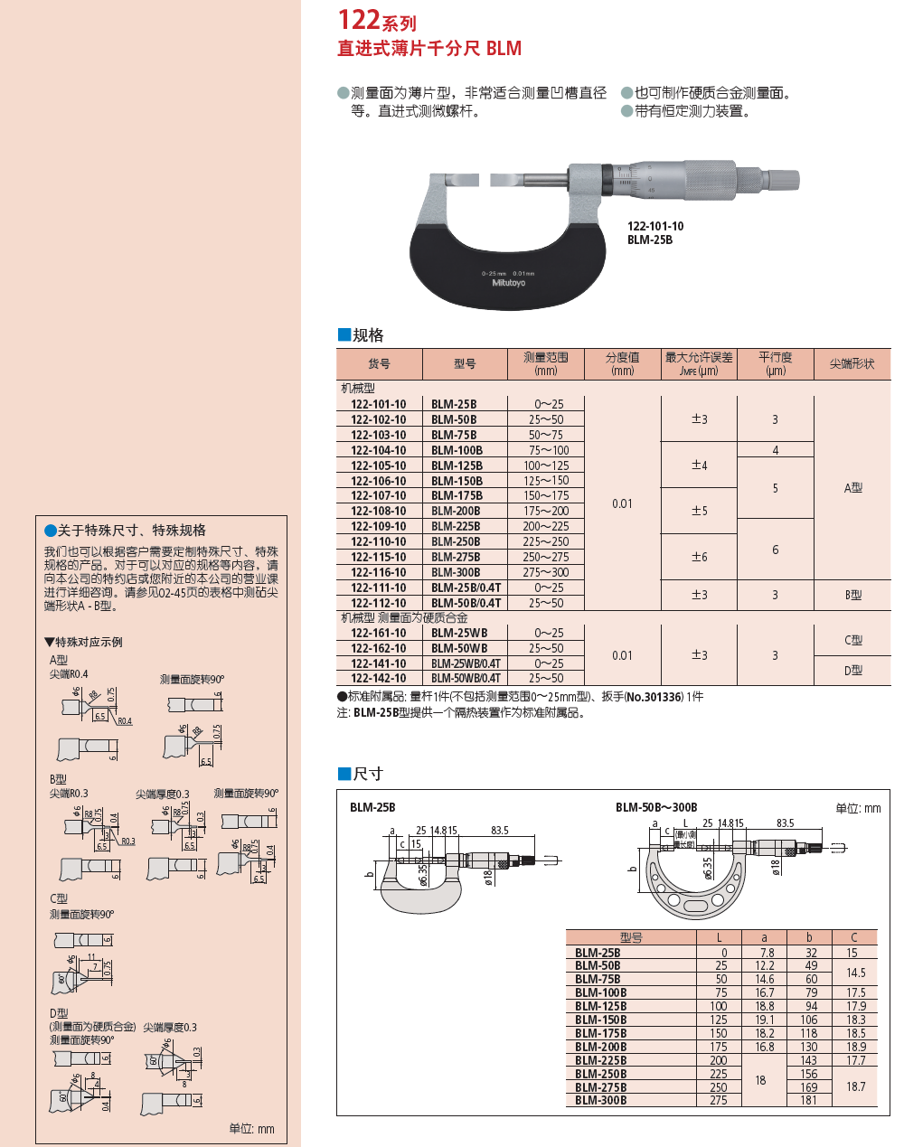 三丰122-101-10叶片千分尺0-25mm薄片型外径千分尺刀口外径千分尺0.75mm厚