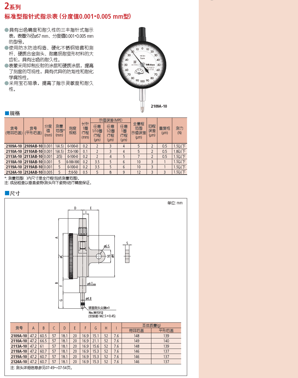 三丰原装指针千分表2109A-10 2110A-10机械千分表0-1*0.001mm日本2113A-10