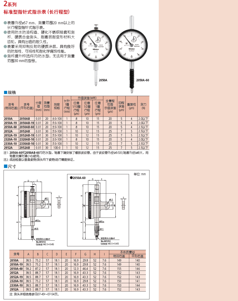 ● 表圈外径ø57 mm、测量范围20 mm以上的长行程型指针式指示表。
