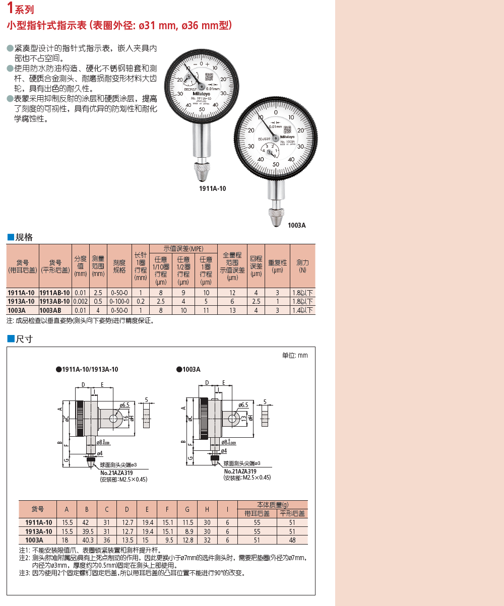 1系列小型指针式指示表 (表圈外径: ø31 mm, ø36 mm型)