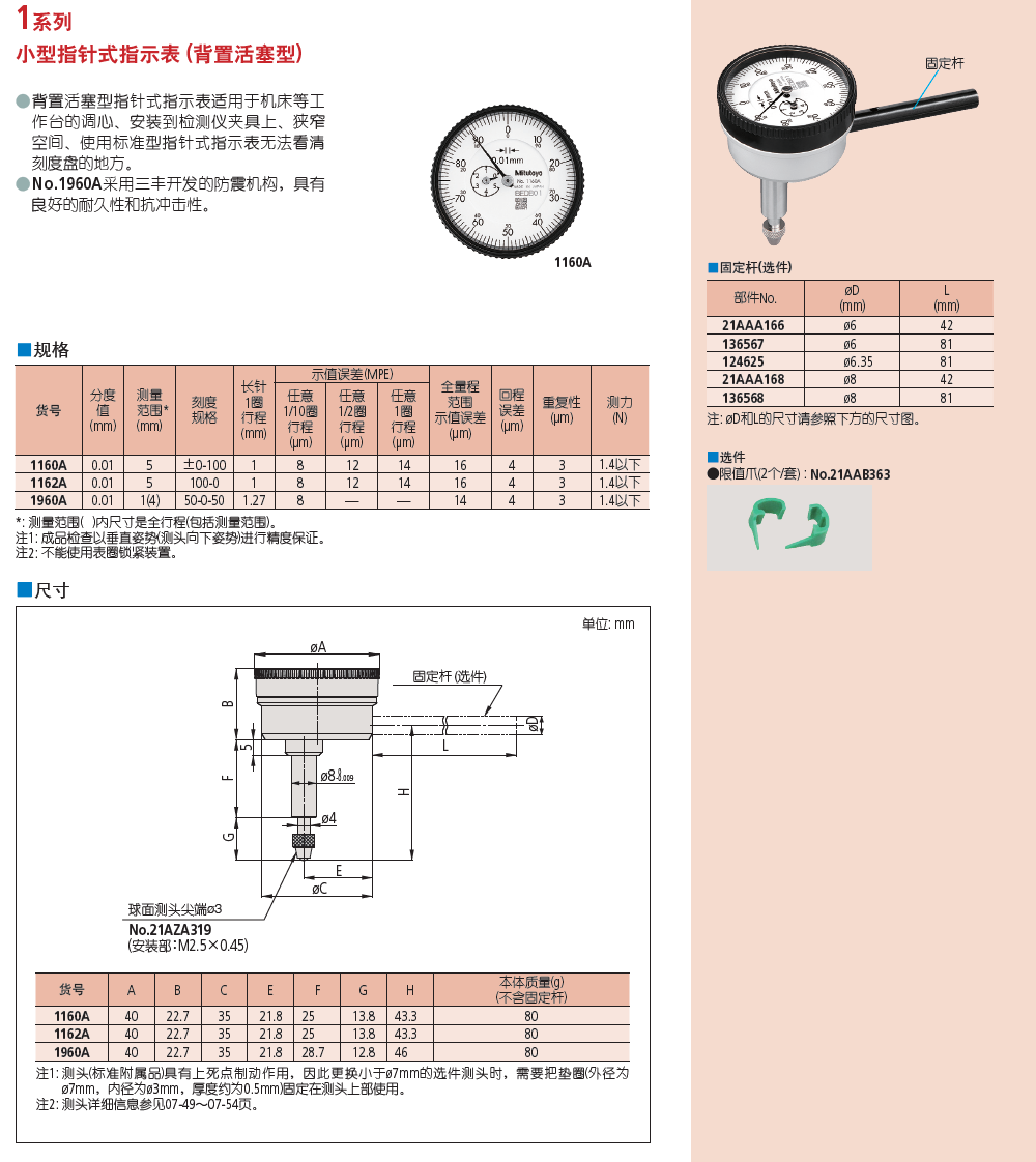 ● No.1960A采用三丰开发的防震机构,具有良好的耐久性和抗冲击性。