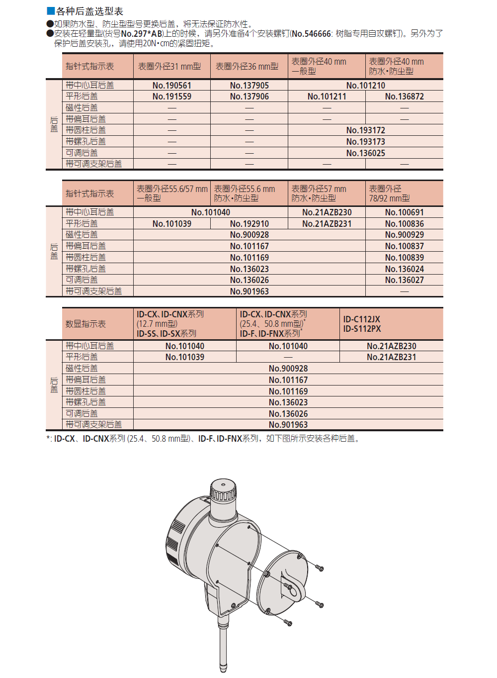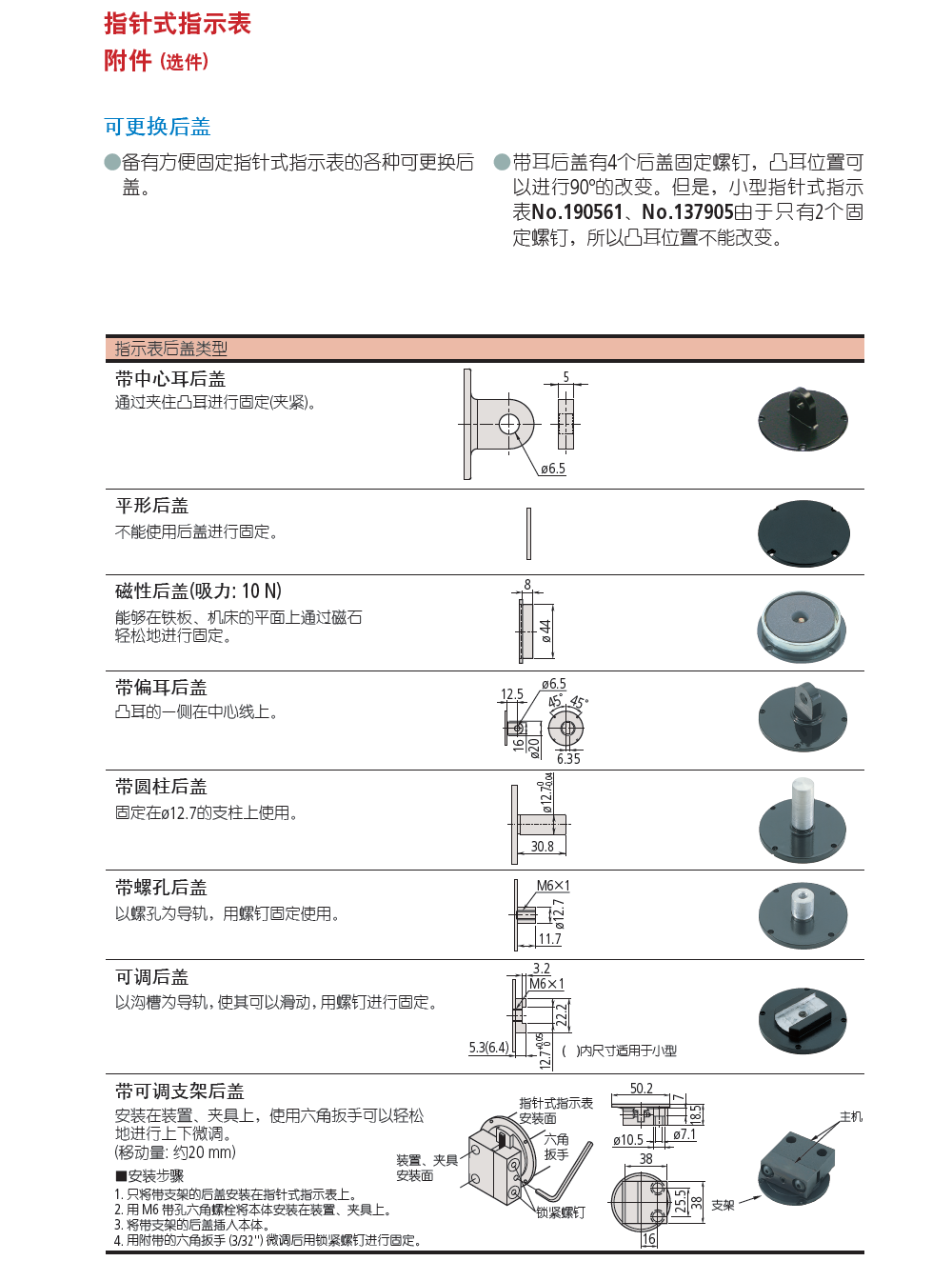 ● 带耳后盖有4个后盖固定螺钉,凸耳位置可以进行90º的改变。但是,小型指针式指示表No.190561、No.137905由于只有2个固定螺钉,所以凸耳位置不能改变。