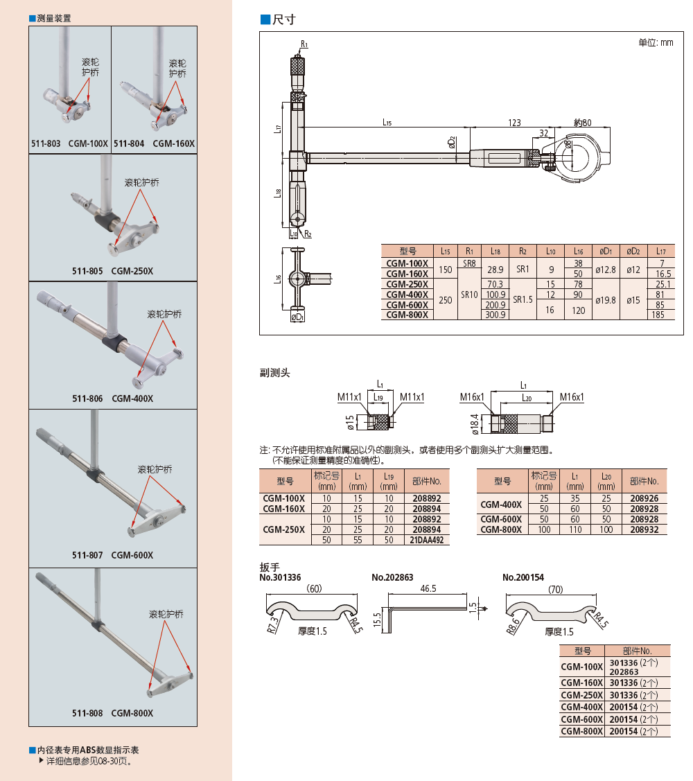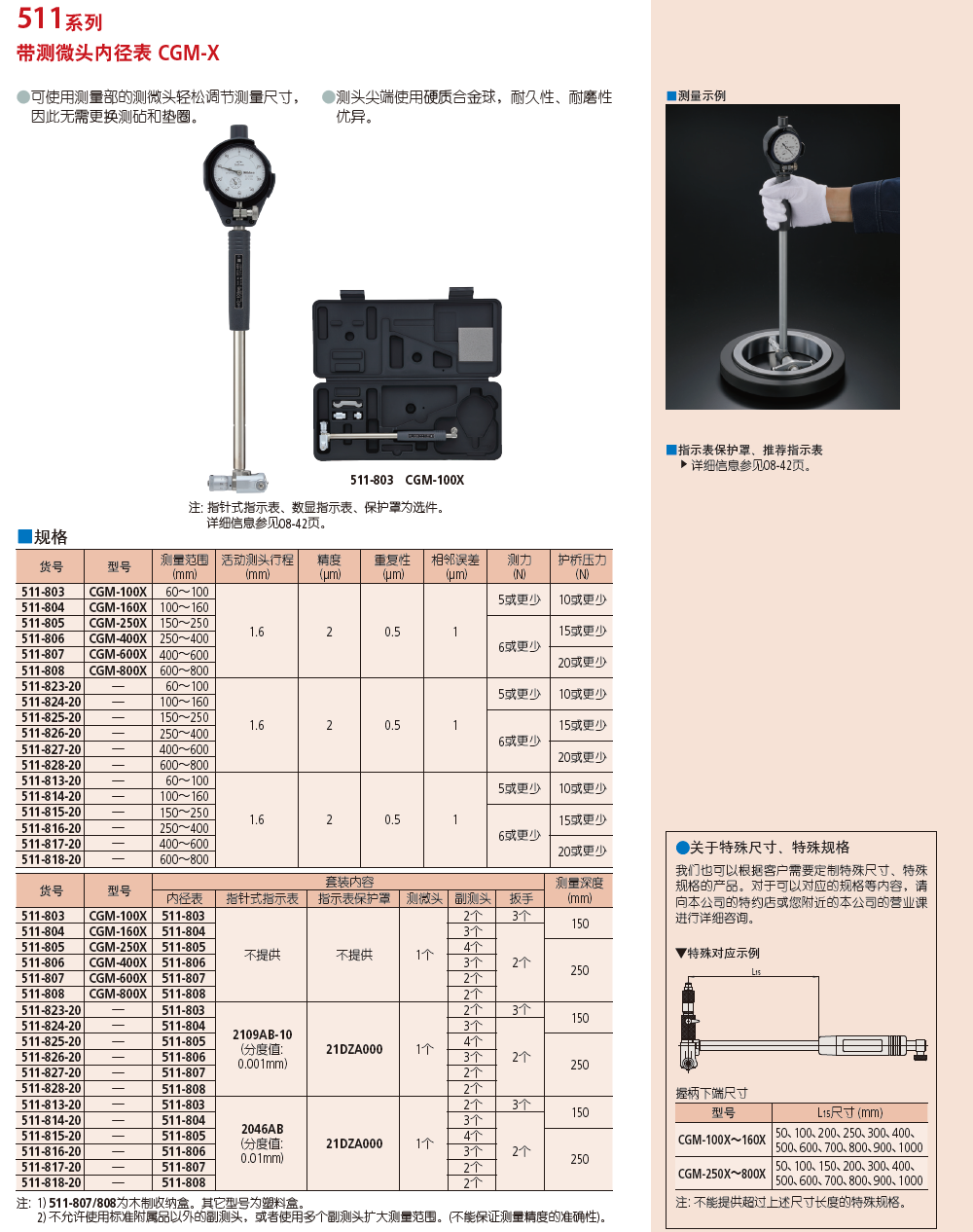 三丰511-803带测微头内径表60-800mm内径百分表511-813-20大量程内径千分表
