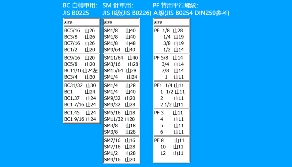 ISO:M.G.Tr.Rc.ANSI:M.UNC.UNF.UN.NPT.NPTF.ANPT.NPSM.ACME.BUTT.JIS:M.UNC.UNF.SM.BC.PT.PF.NPT.NPTF.TV.DIN:DIN2999.259.13.DINISO.BSI:M.BSW.BSP.BSF.BSPT.