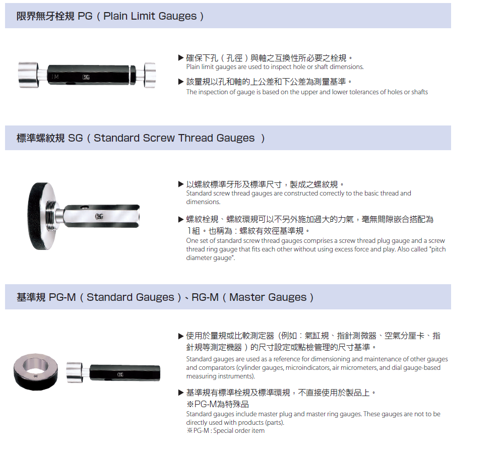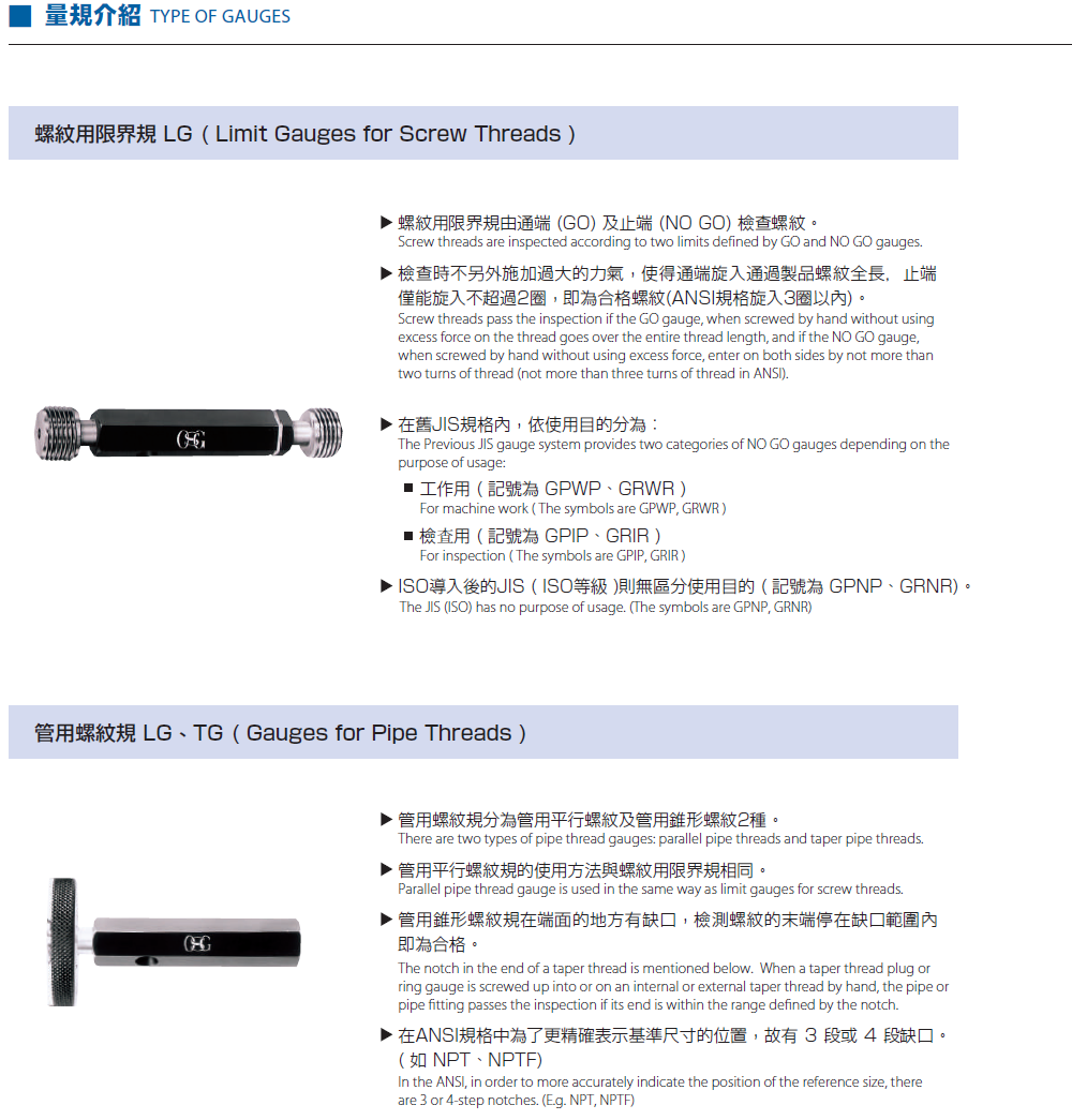 螺紋用限界螺紋規(LG):栓規, 管用螺紋規(TG),標準螺紋規(SG),限界栓規(PG、RG),磨耗點檢螺紋規(LCG),