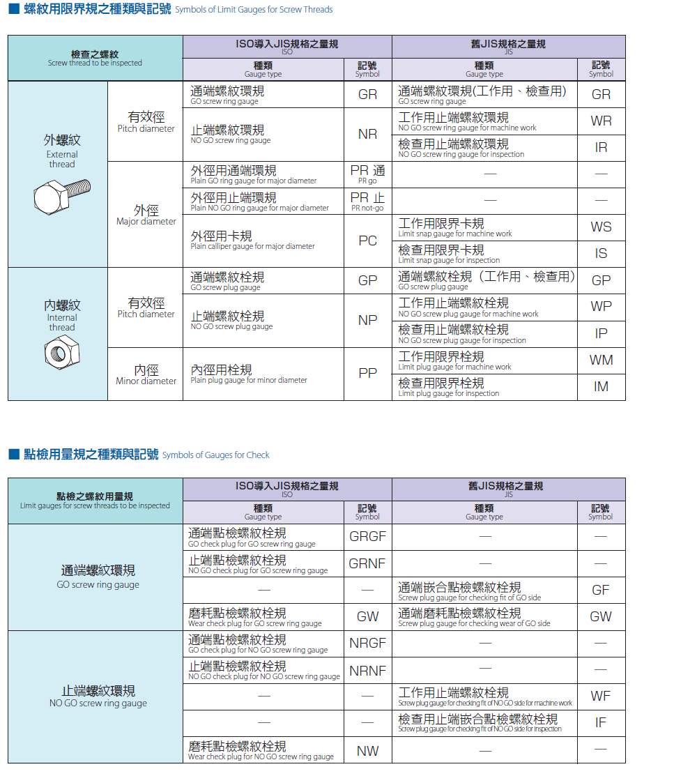 JIS 1级 JIS 2级 JIS 3级 工作塞规:GPWP 检查塞规:GPIP 工作环规:GRWR 检查环规:GRIR |