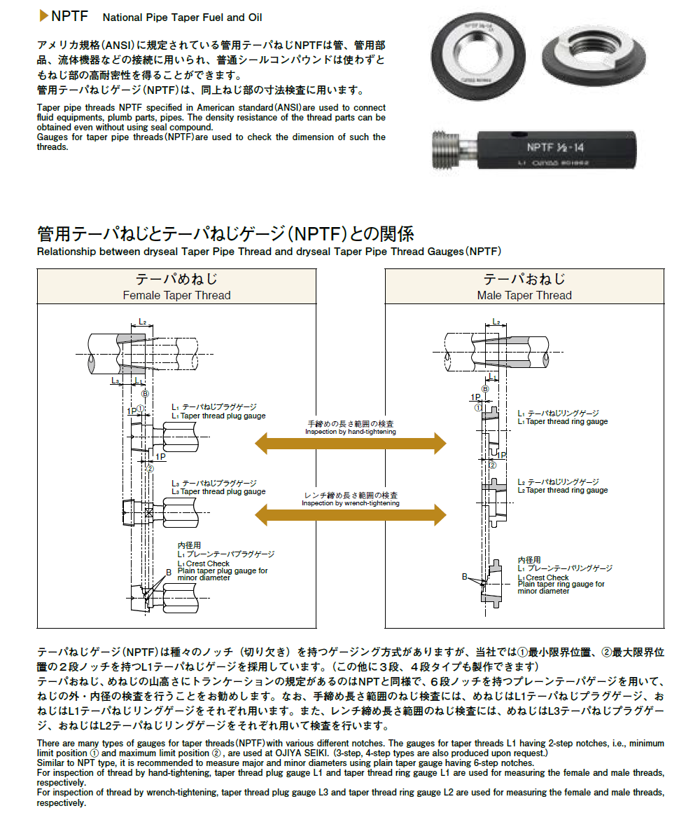 日本ojiyas,ojiyas极限螺纹量规,ojiyas界限螺纹通止规,ojiyas螺纹塞规,ojiyas螺纹环规,美制管螺纹塞规环规,NPT标准:ANSI/ASME B1.20.1、NPTF标准:ANSI B1.20.5、ANPT标准:MIL-P-7105B/SAE AS71051标准。 |