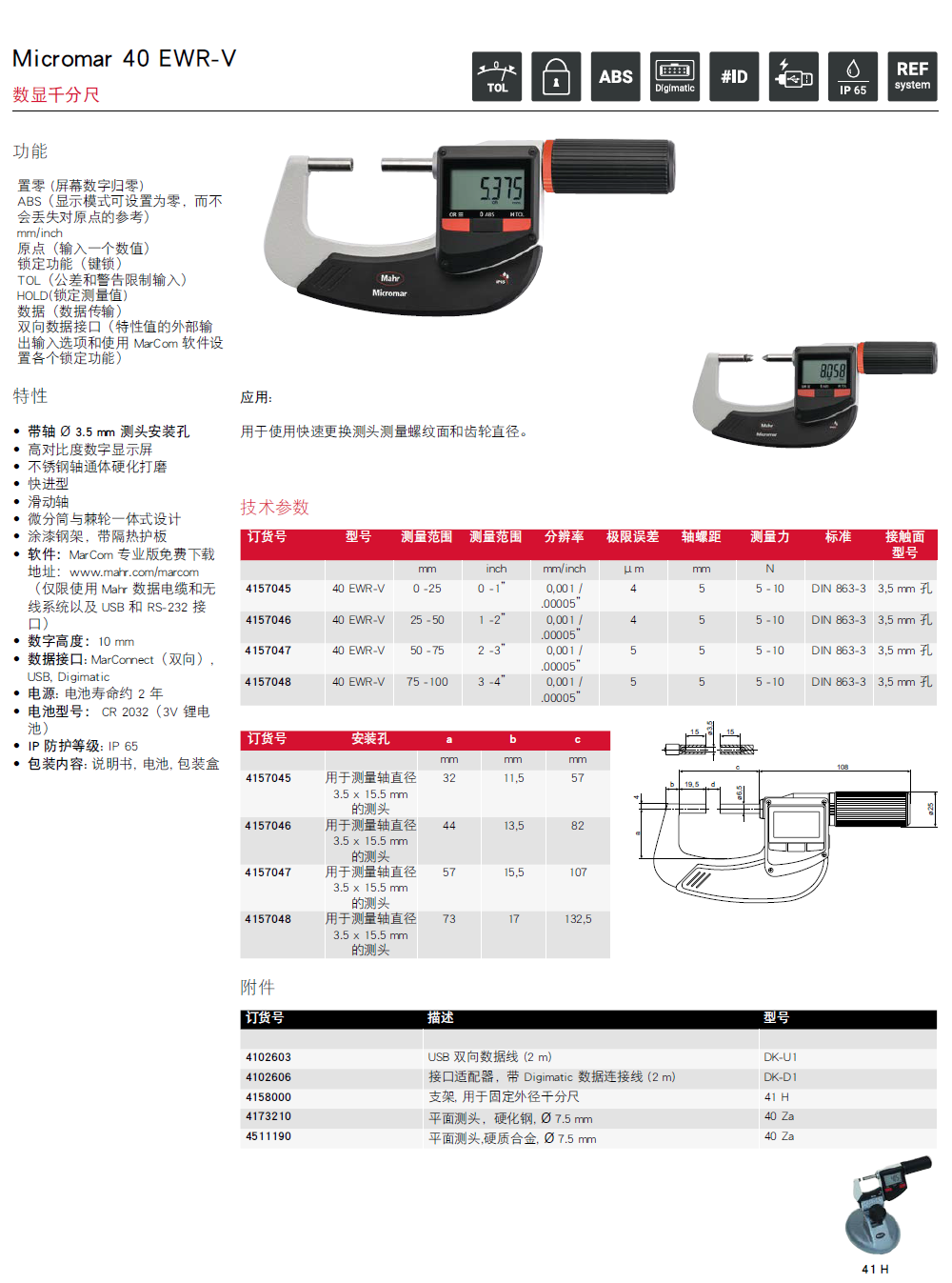 德国Mahr齿轮千分尺Micromar 40 EWRi-V无线齿轮节径千分尺齿轮跨棒距数显千分尺