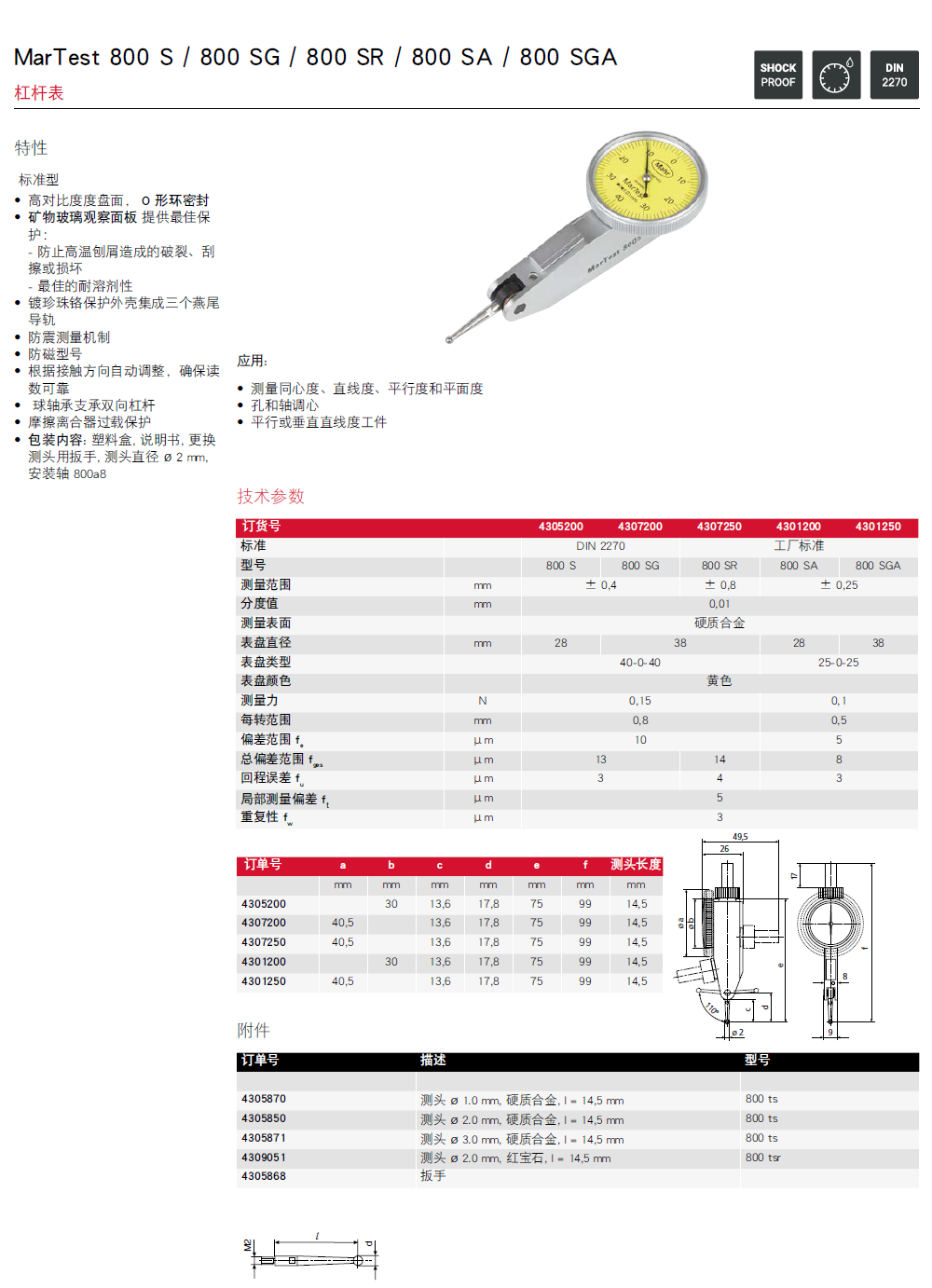 MarTest 800 S / 800 SG / 800 SR / 800 SA / 800 SGA标准型杠杆百分表