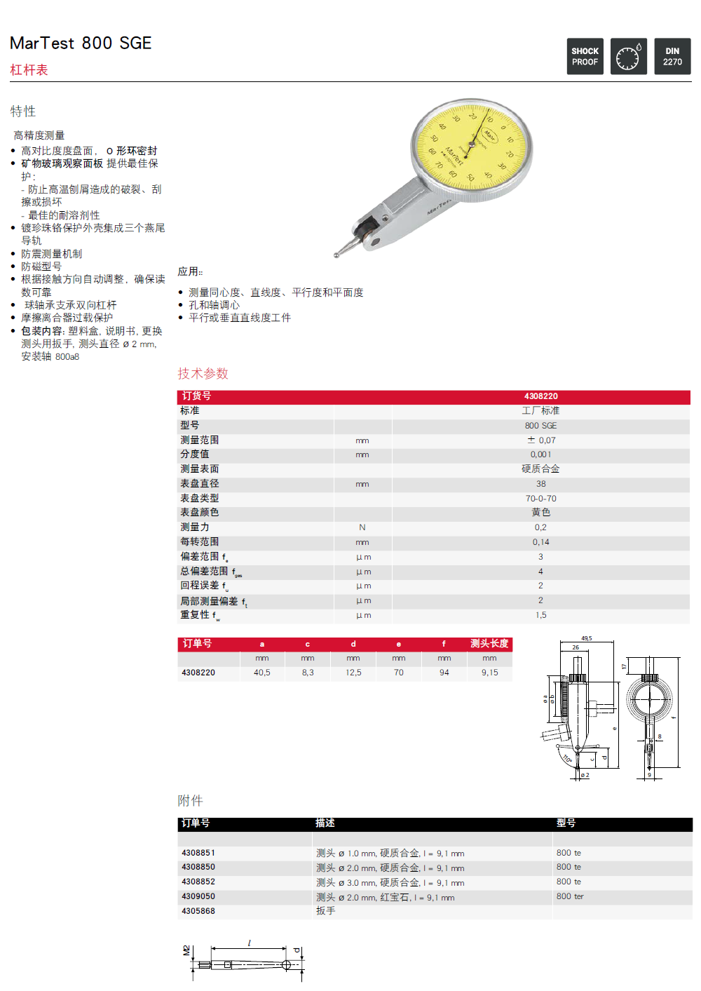 MarTest 800 SGE高精度0.001mm杠杆千分表