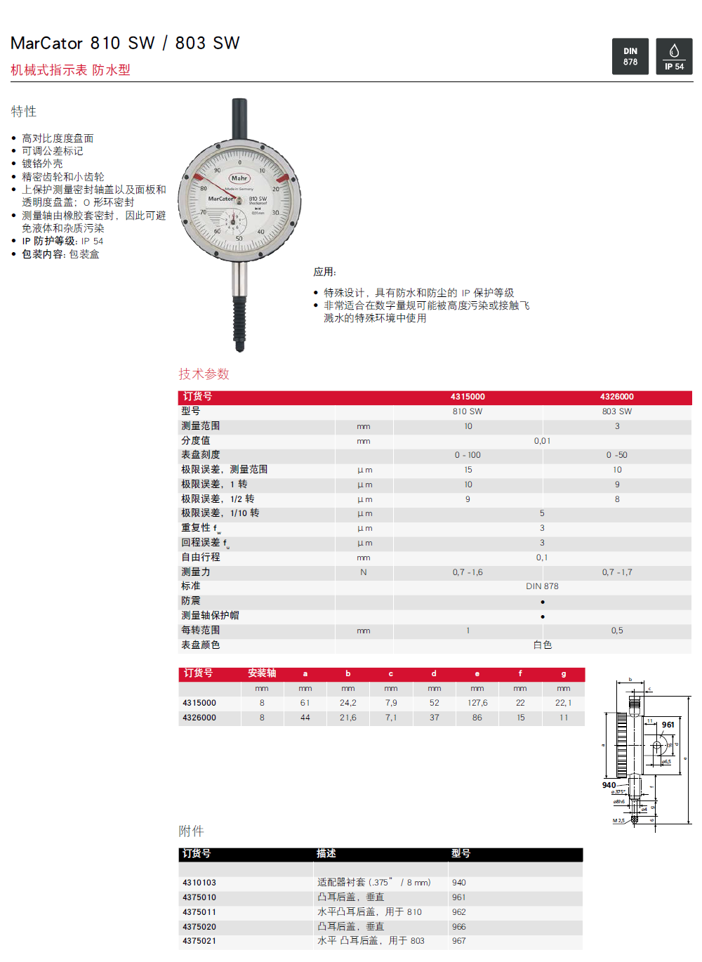 德国马尔MarCator 810 SW防水型指针百分表0-10mm防水机械指示表