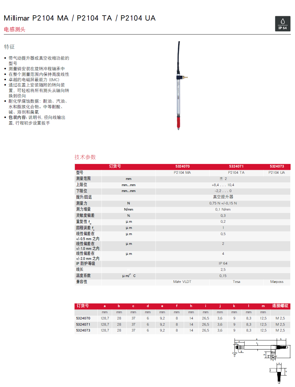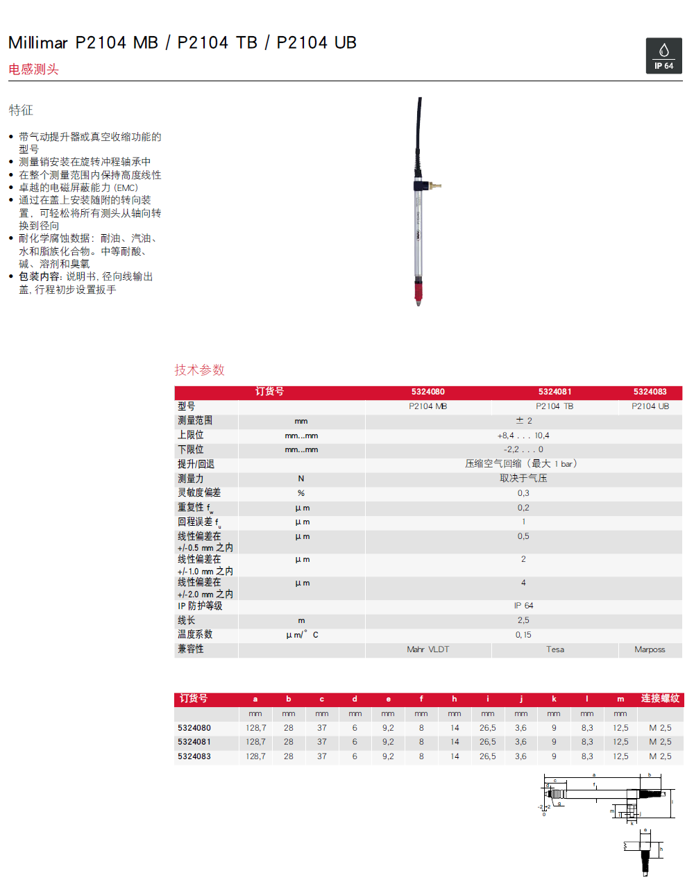 Millimar P2104 MB / P2104 TB / P2104 UB压缩空气回缩电感测头±2mm