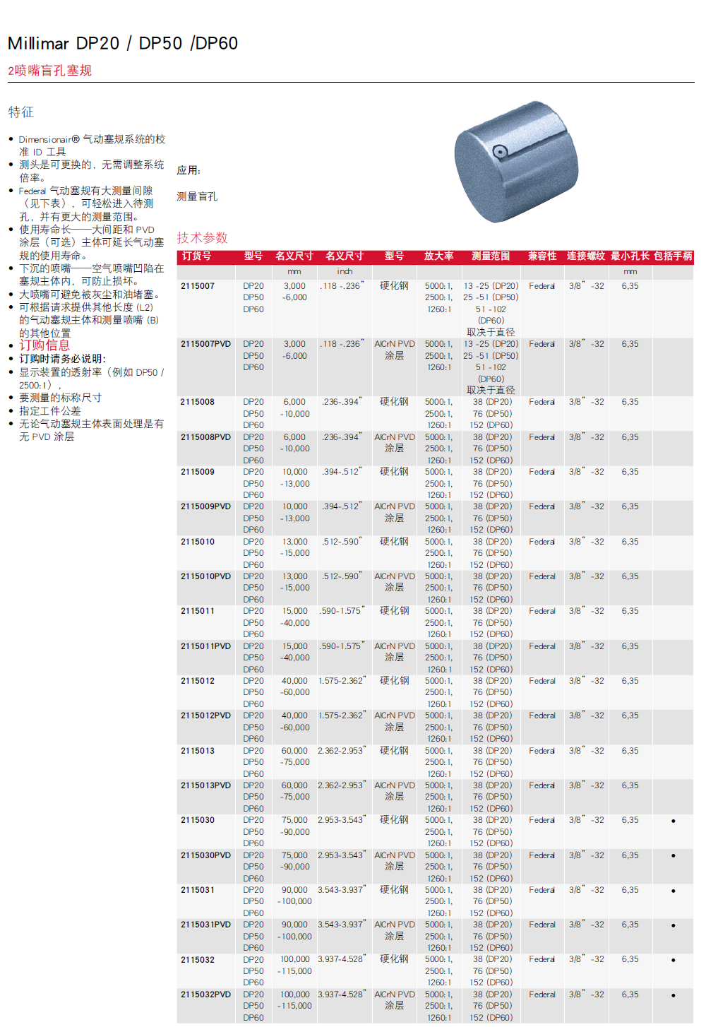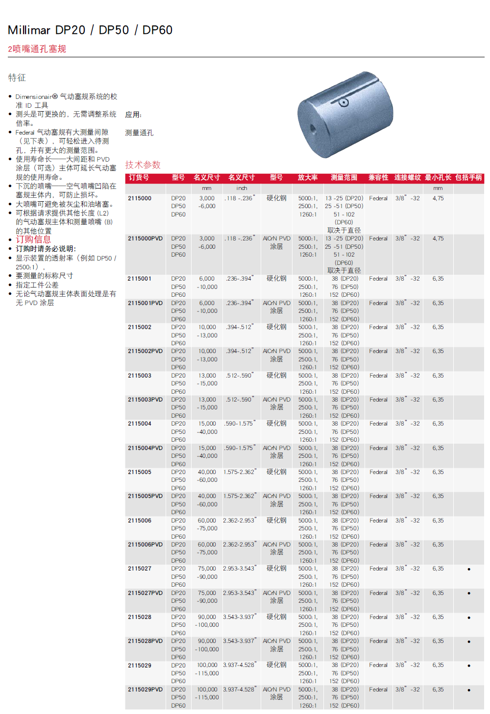 • 无论气动塞规主体表面处理是有无 PVD 涂层