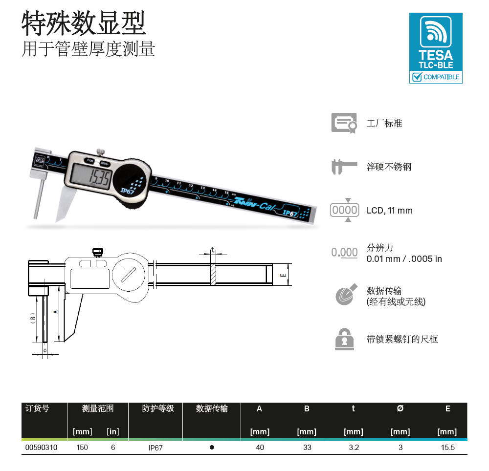 瑞士原装TESA管厚数显卡尺0-150mm壁厚数显卡尺管件壁厚测量卡尺