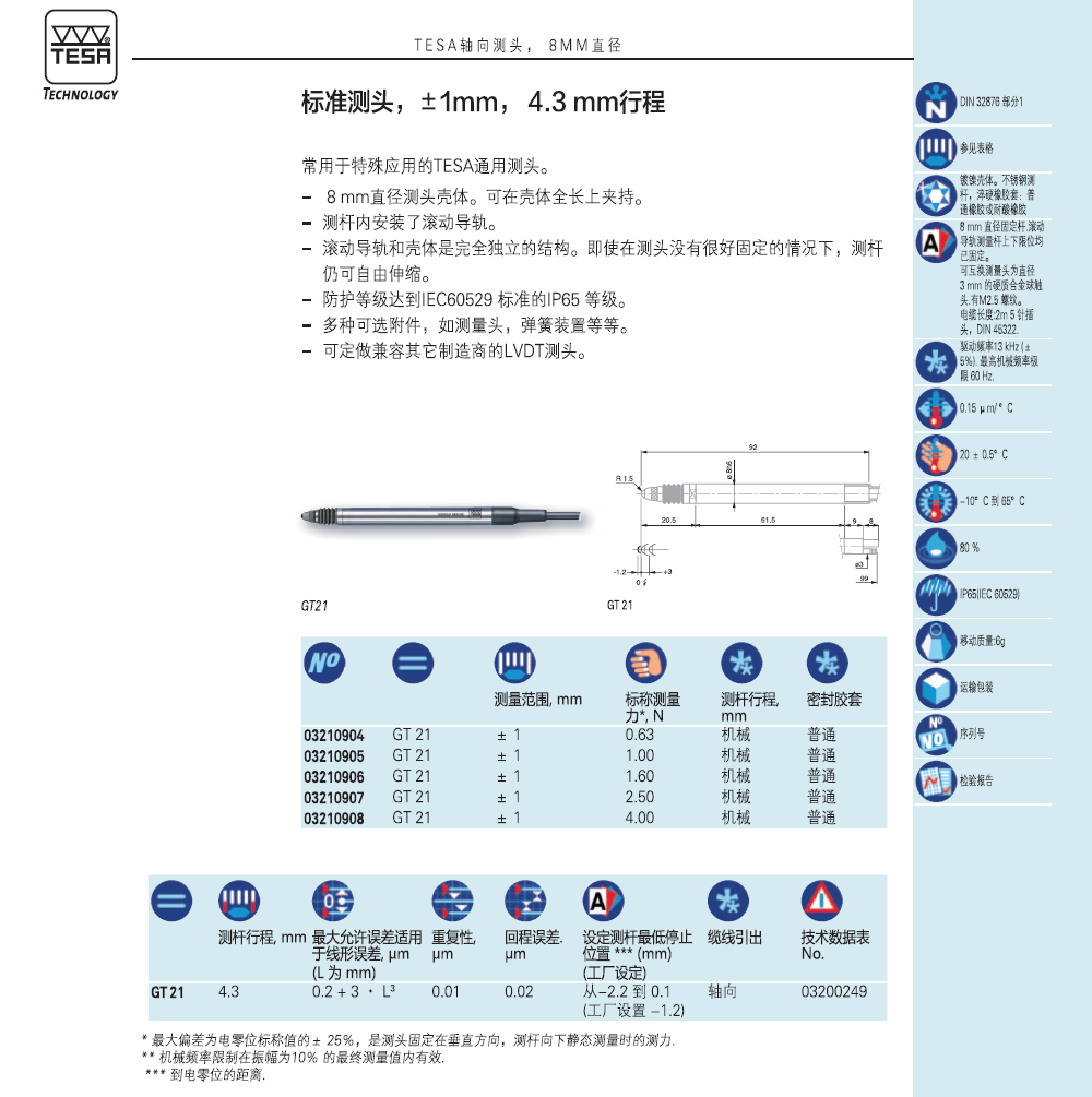 瑞士TESA电感测头GT 21轴向出线±1mm伸缩行程4.3mm径向出线型GT 22移位传感器