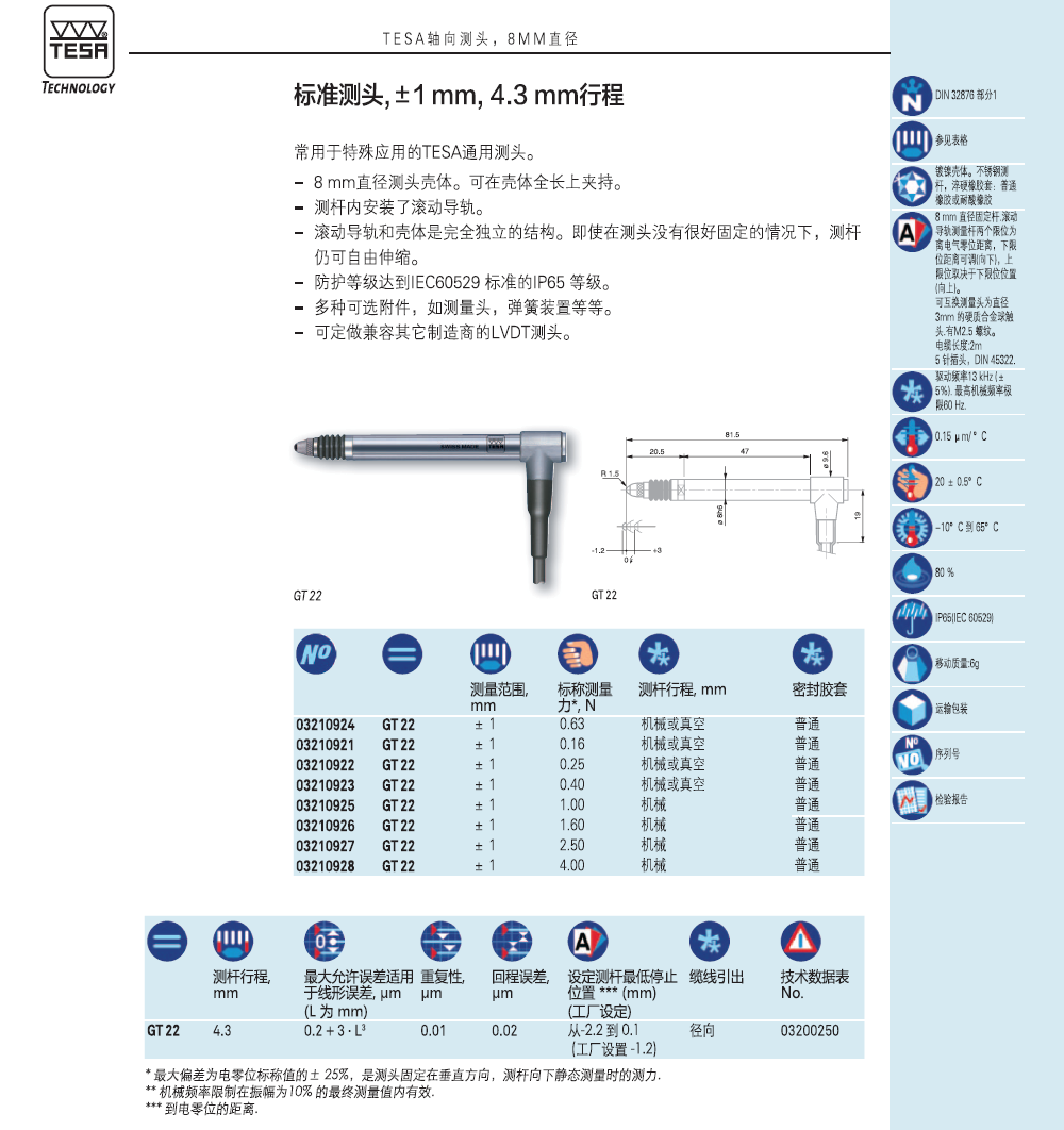 GT 21、GT 22 标准测头,±1mm,4.3mm行程