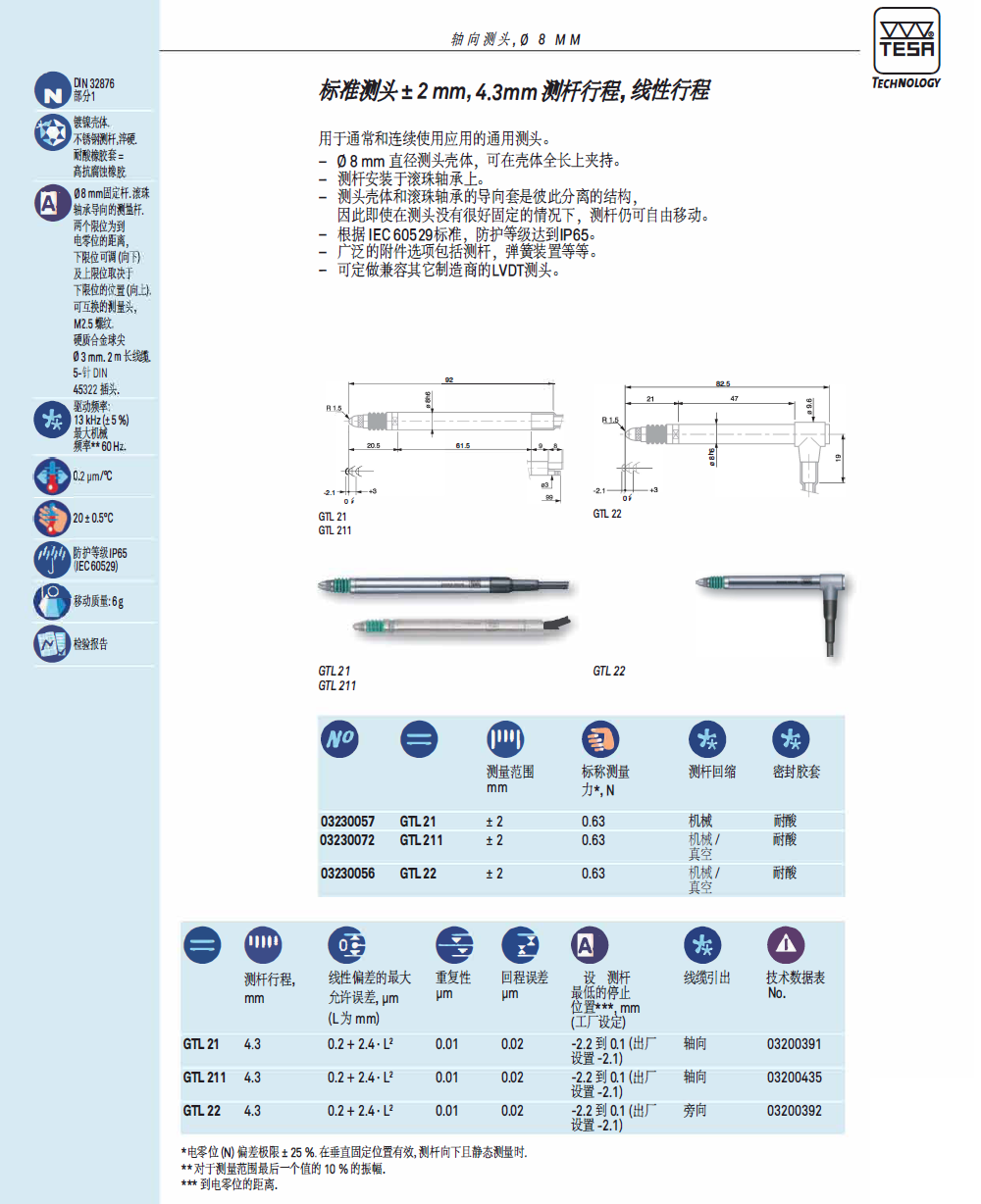 GTL 21、GTL211、 GTL 22标准测头±2 mm,4.3mm 测杆行程,线性行程