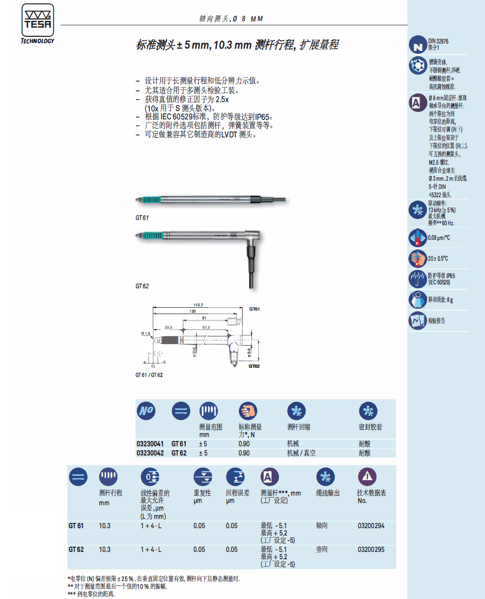 GT 61、GT 62标准测头±5mm,10.3mm 测杆行程,扩展量程