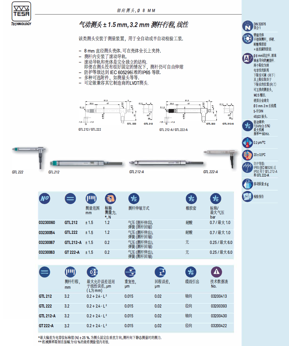 GTL 212、GTL 222、GTL 212-A、GTL 222-A气动测头±1.5 mm,3.2 mm 测杆行程,线性