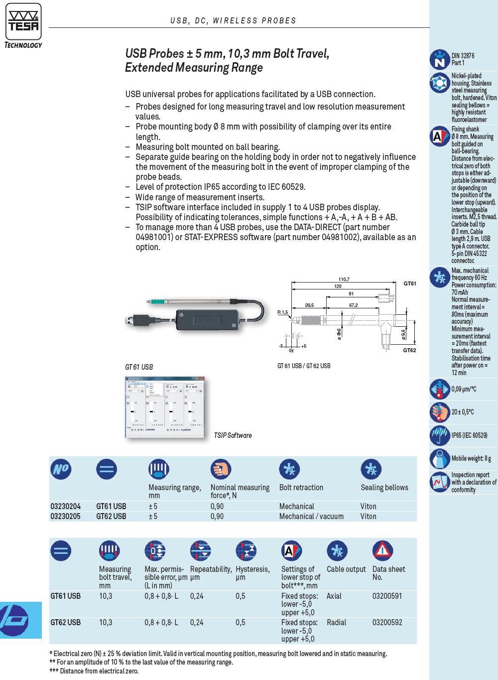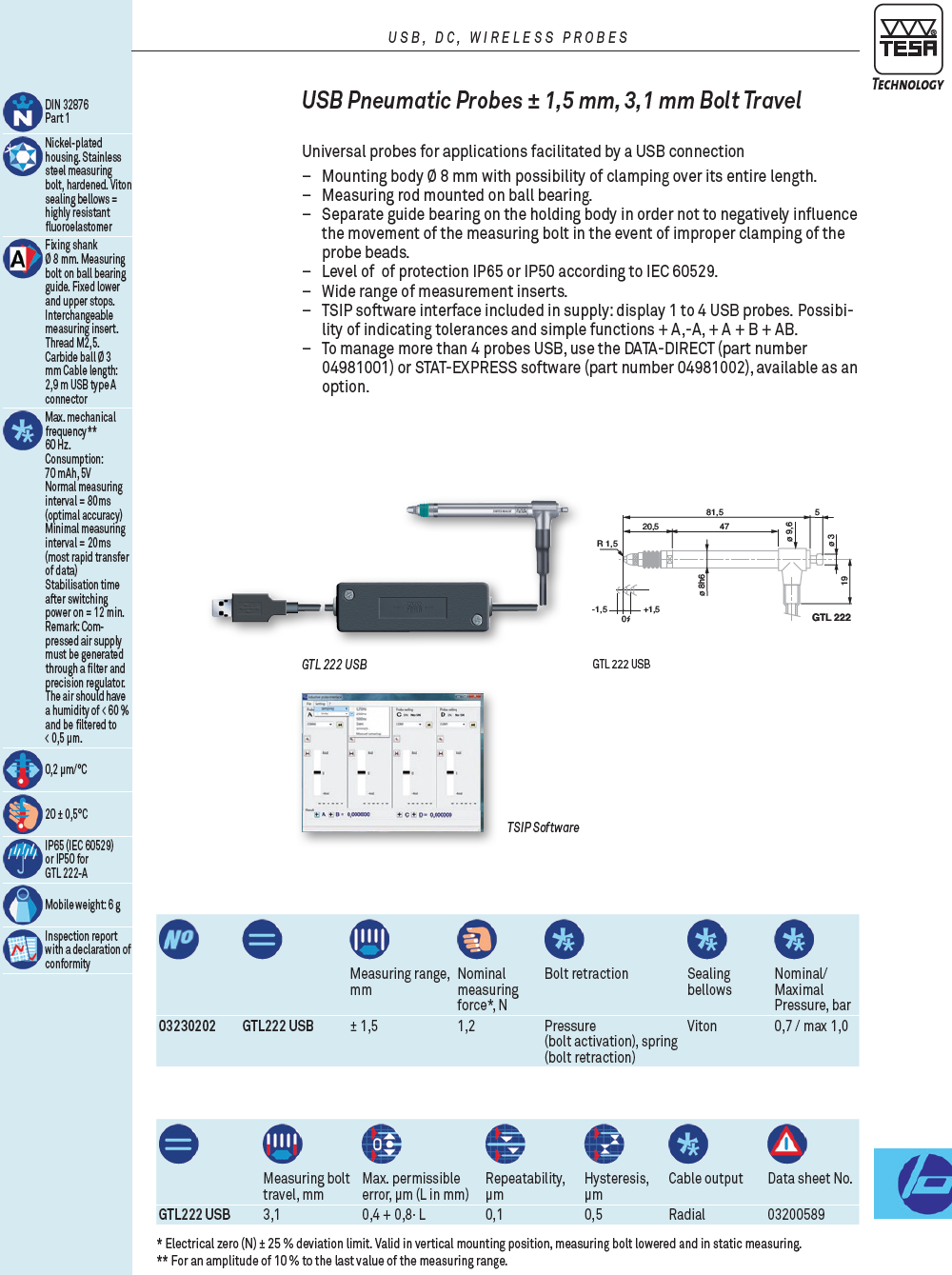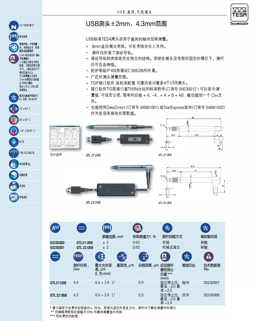 瑞士TESA电感测头USB插口可与电脑连接电感测量仪GT21 USB位移传感器