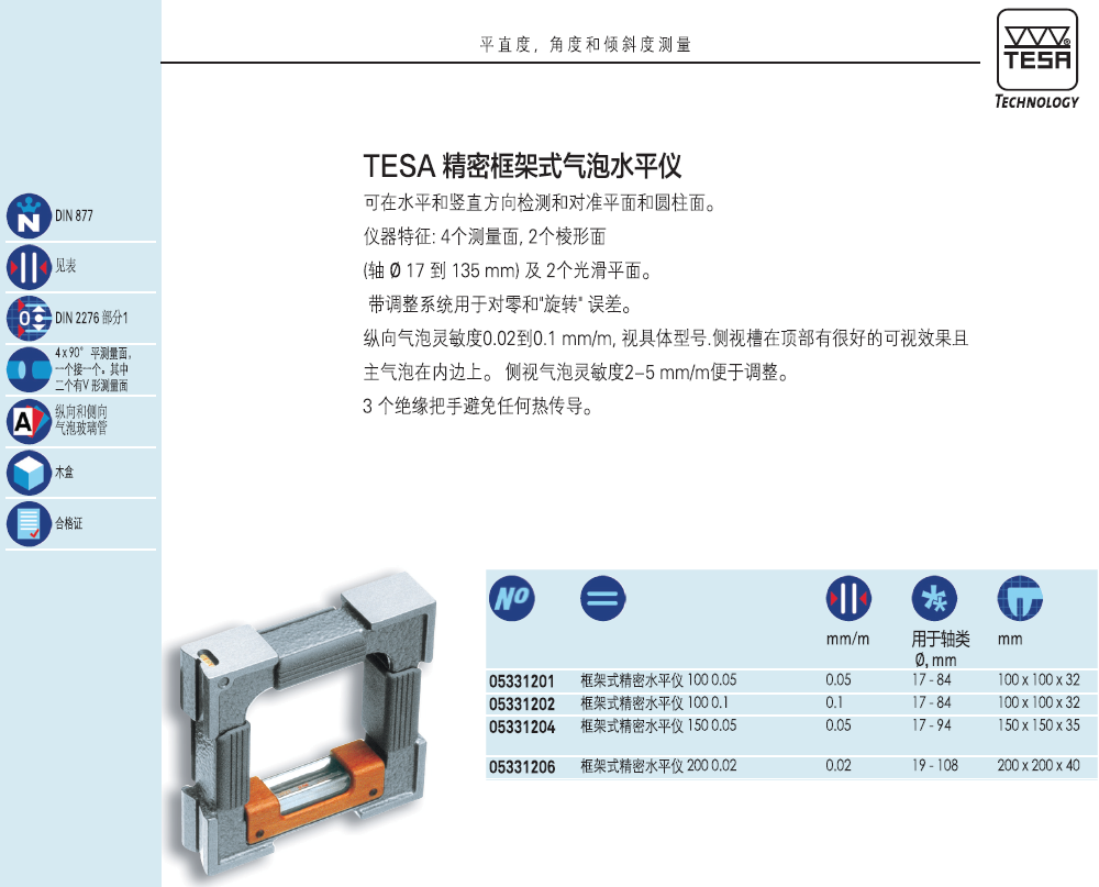 瑞士TESA精密框式气泡水平仪框架式水平测量仪垂直度直角度测量仪