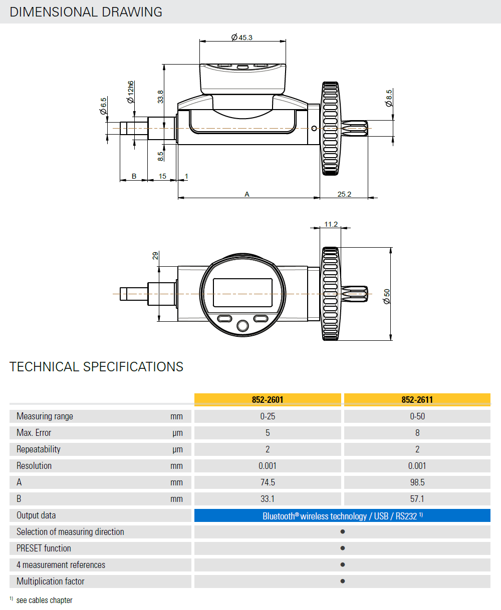瑞士sylvac数显微分头XYZ轴微调千分头852-2601无线蓝牙传输功能型数显测微头