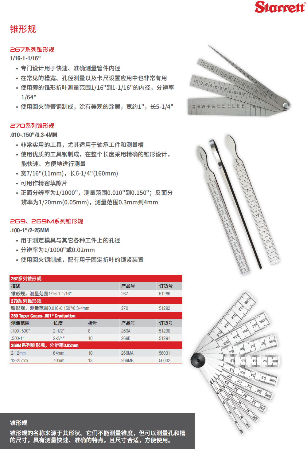starrett施泰力267锥形规槽宽塞尺270系列锥形塞规269M孔径测量锥形塞尺