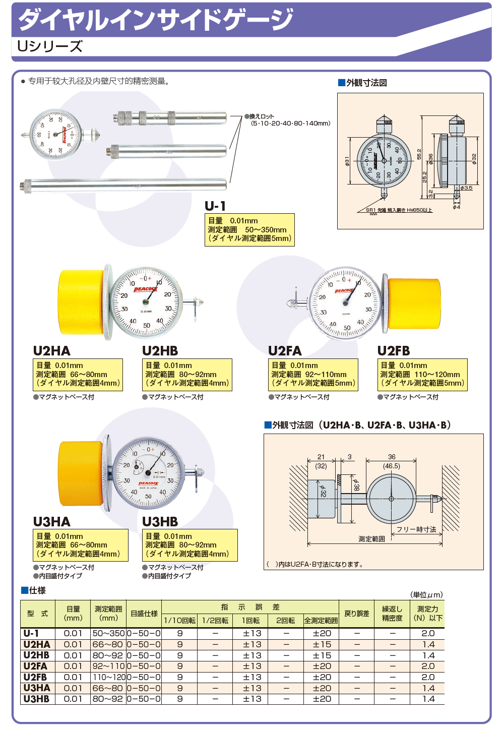 日本PEACOCK尾崎U2HA内孔测量仪U2HB大内孔测量仪U型内径测量仪U-1