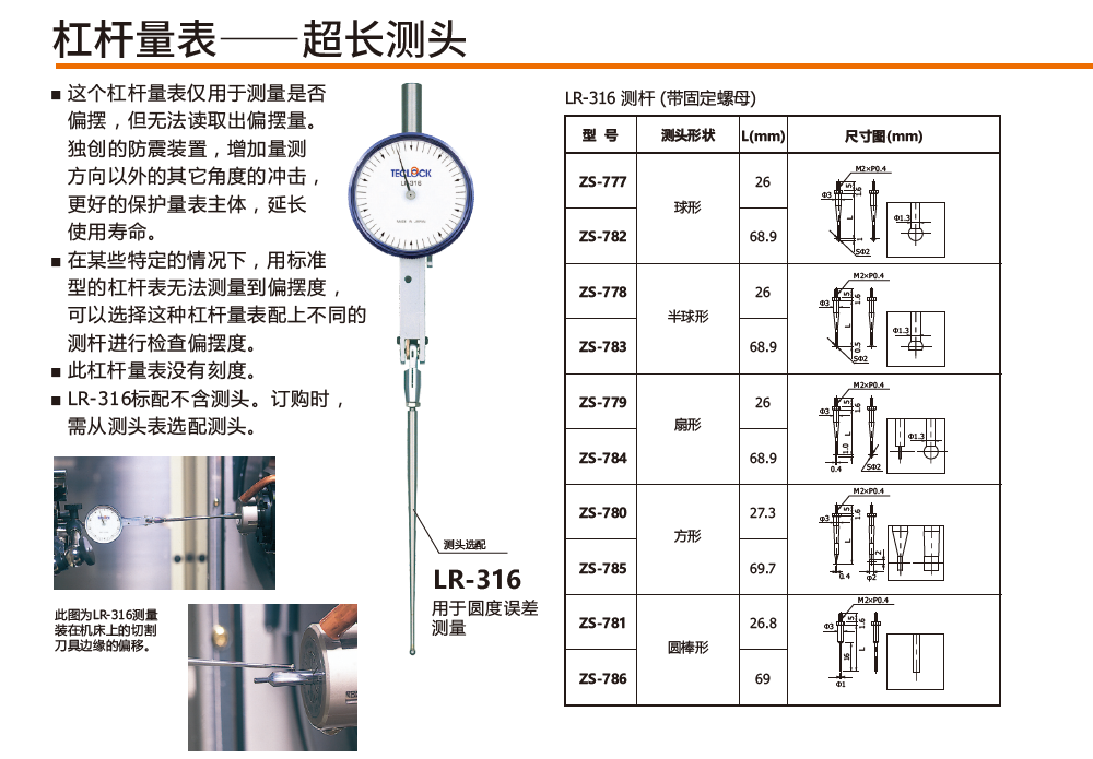 日本teclock得乐超长测头杠杆表LR-316偏摆杠杆表跳动杠杆表圆测量杠杆表