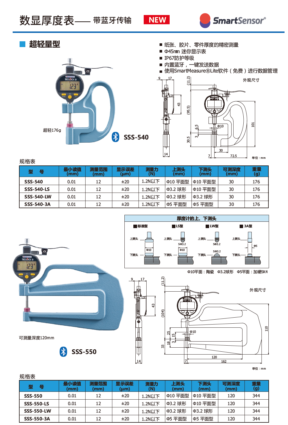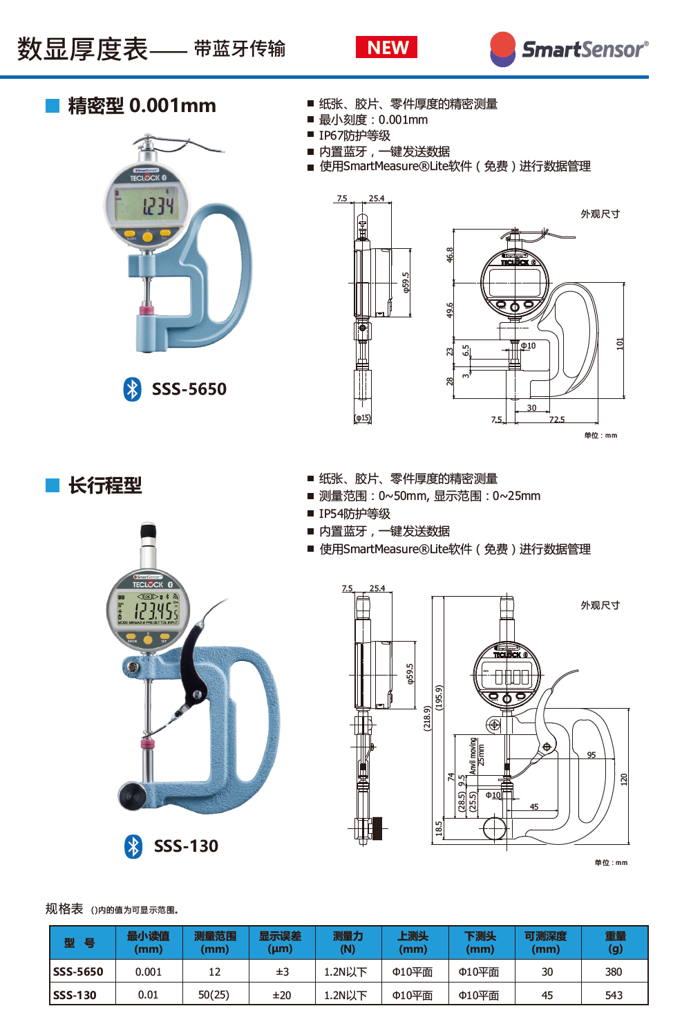 日本teclock数显蓝牙测厚规SSS-540带无线传输功能厚度表SSS-130无线厚度表