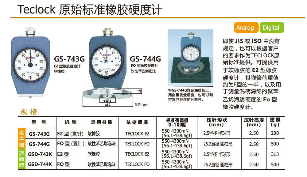 日本teclock得乐GS-743G软橡胶硬度计E2型GS-744G海绵硬度计苯乙烯泡沫硬度计FO型厂家标准