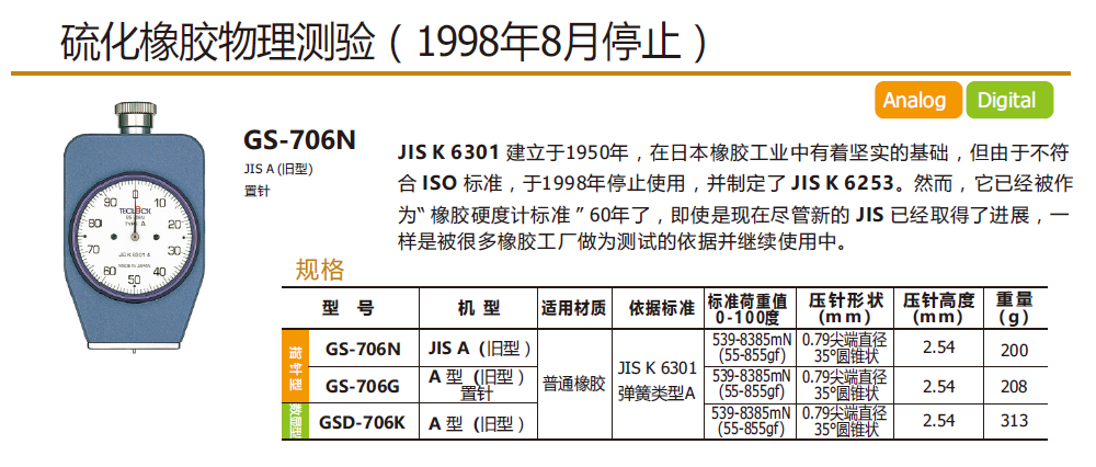 teclock得乐GS-706N日本JIS橡胶硬度计GS-706G日本JIS K 6301旧标准A型邵氏橡胶硬度计