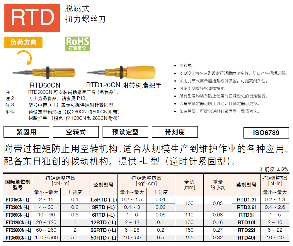 ● RTD设计为在达到设定扭矩后棘轮空转,防止产生扭矩过载。