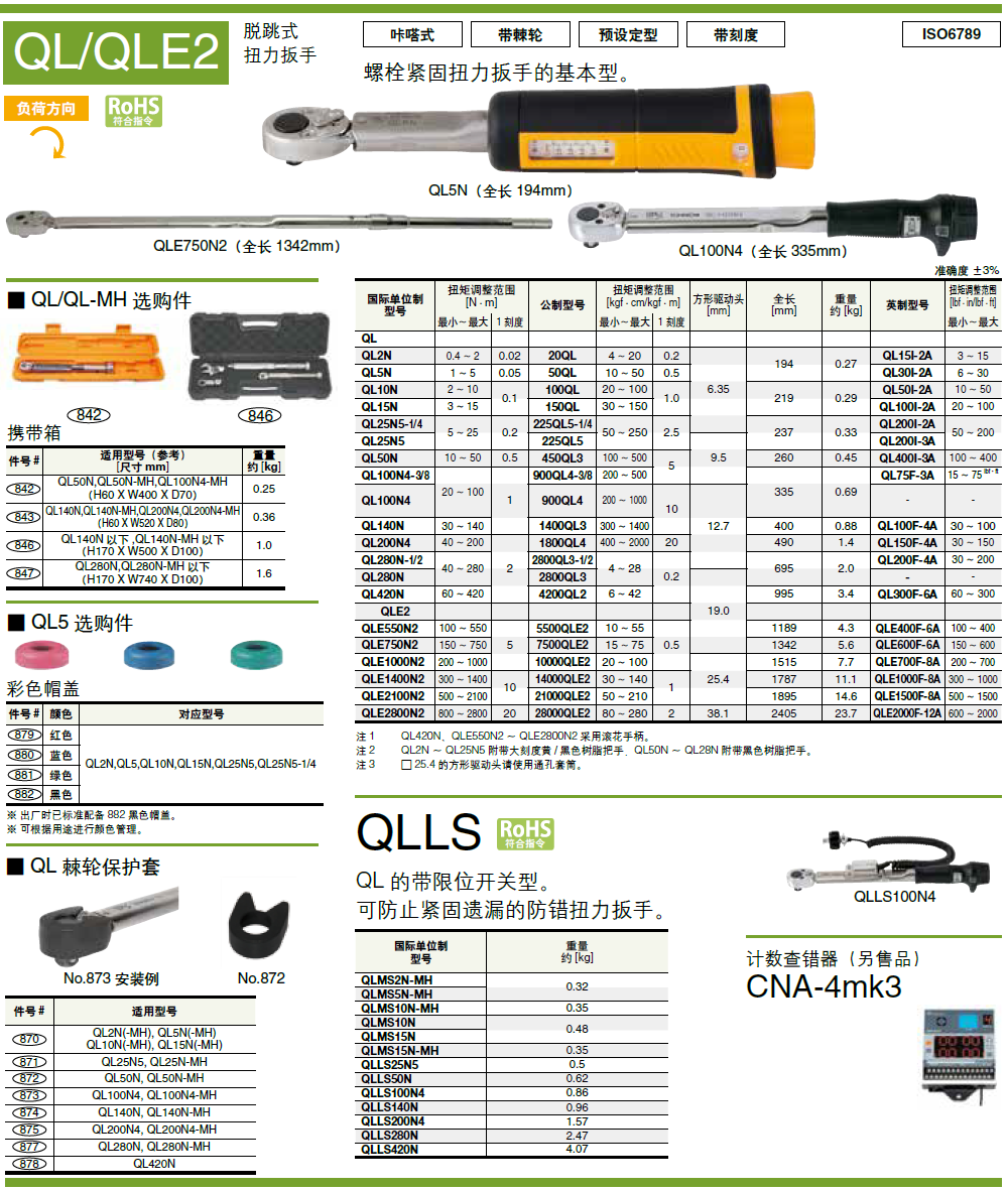 ● QL50N~280N是树脂手柄,QL420N是金属手柄。