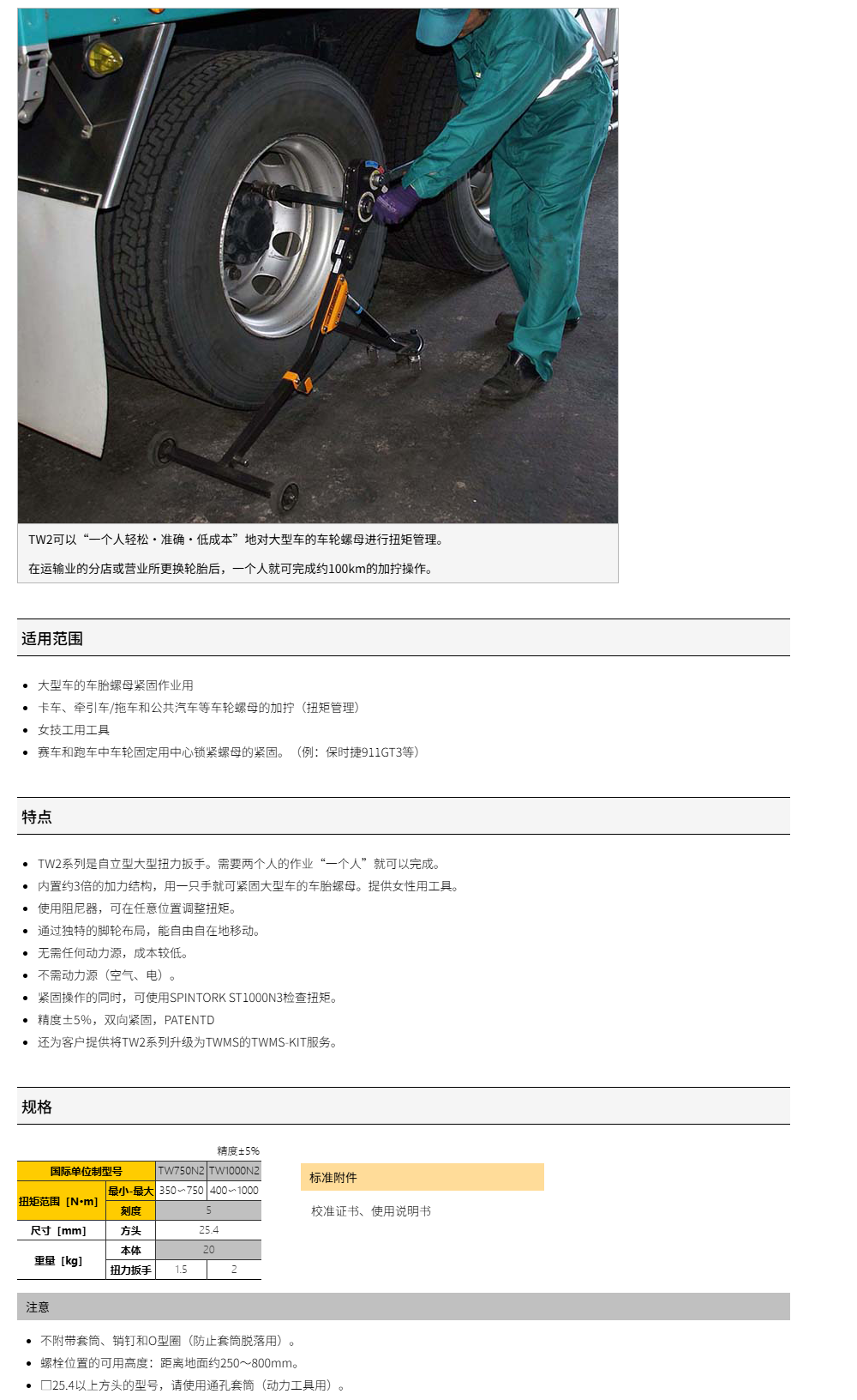 ● TW2系列是自立型大型扭力扳手。需要两个人的作业“一个人”就可以完成。