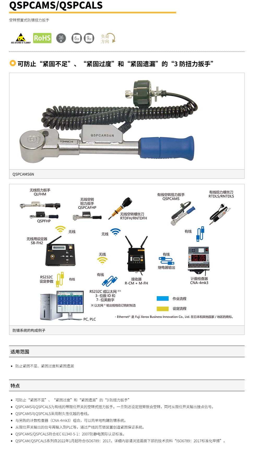 ● QSPCAMS与QSPCALS为有线的带限位开关的空转式扭力扳手。一旦到达设定扭矩就会空转,同时从限位开关输出接点信号。