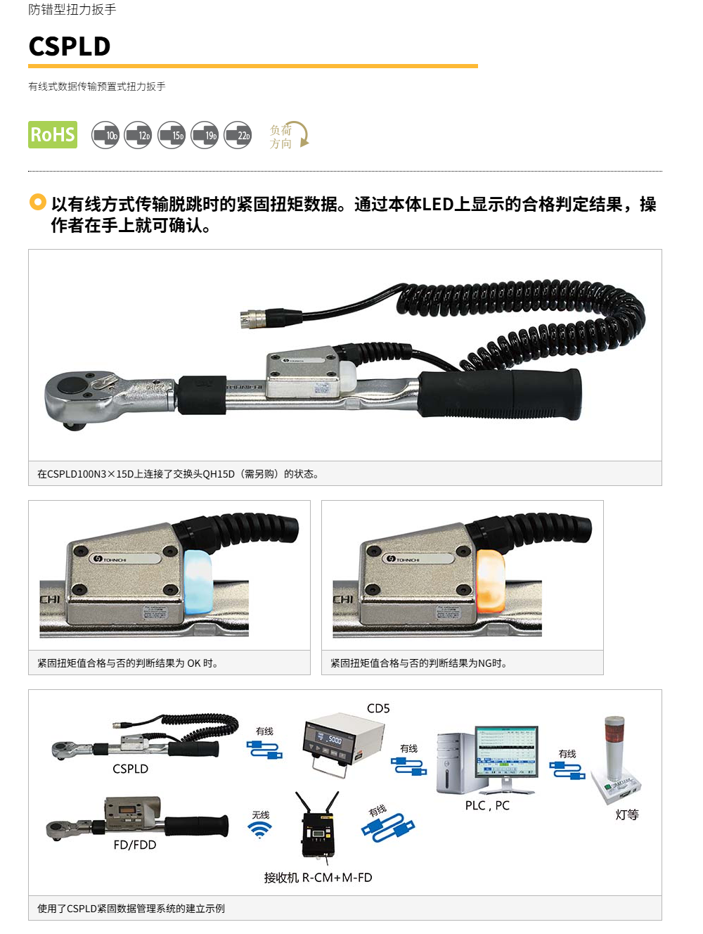● 在有线式数据传输预置式扭力扳手CSPLD系列的本体LED上显示紧固扭矩的合格判定结果。操作者在手上就可简单地进行确认。