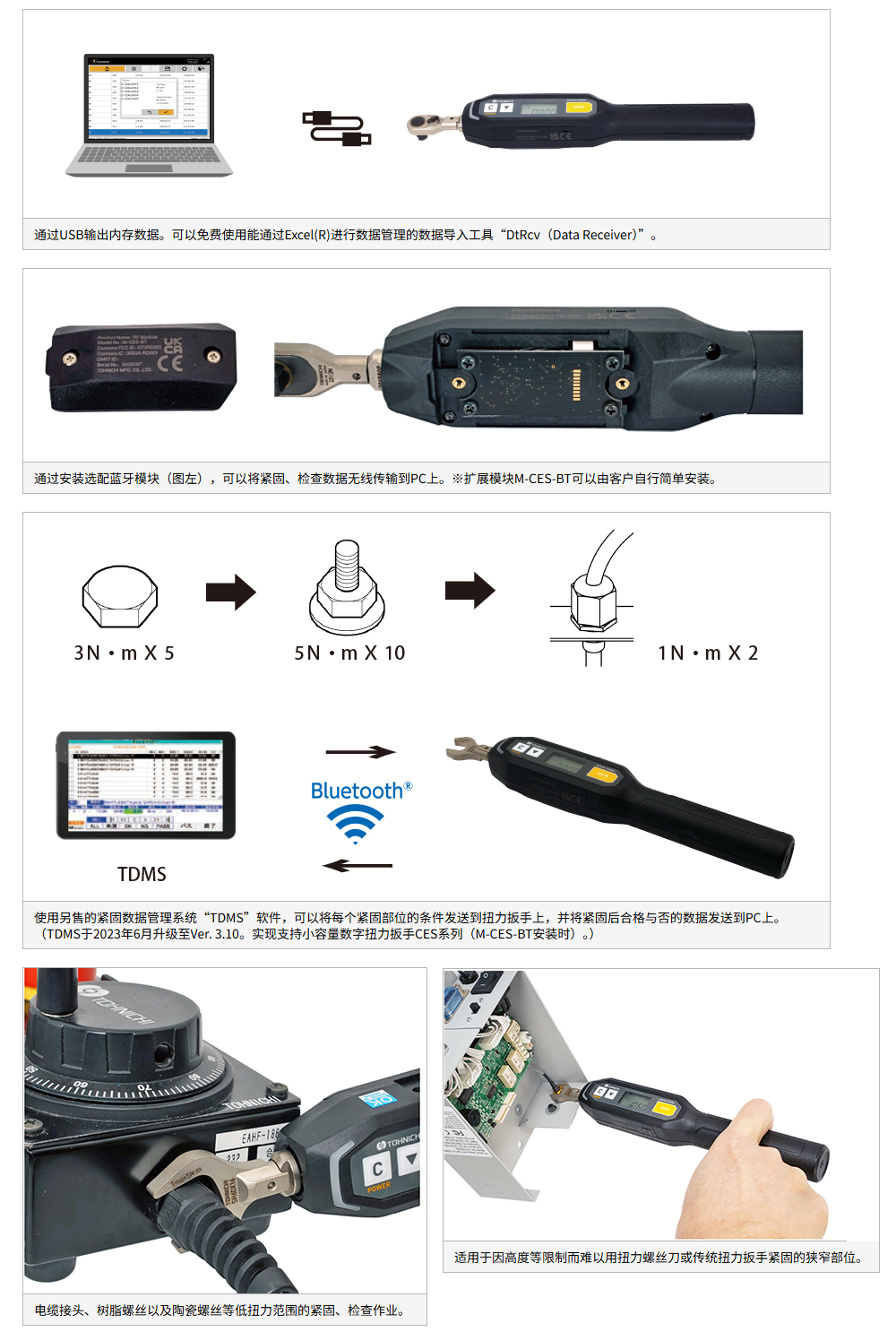 ● 数据收发功能:通过USB输出内存数据。可以免费使用能通过Excel(R)进行数据管理的数据导入工具“DtRcv(Data Receiver)”。通过安装选配蓝牙模块,可以将紧固、检查数据无线传输到PC上。※扩展模块M-CES-BT可以由客户自行简单安装。