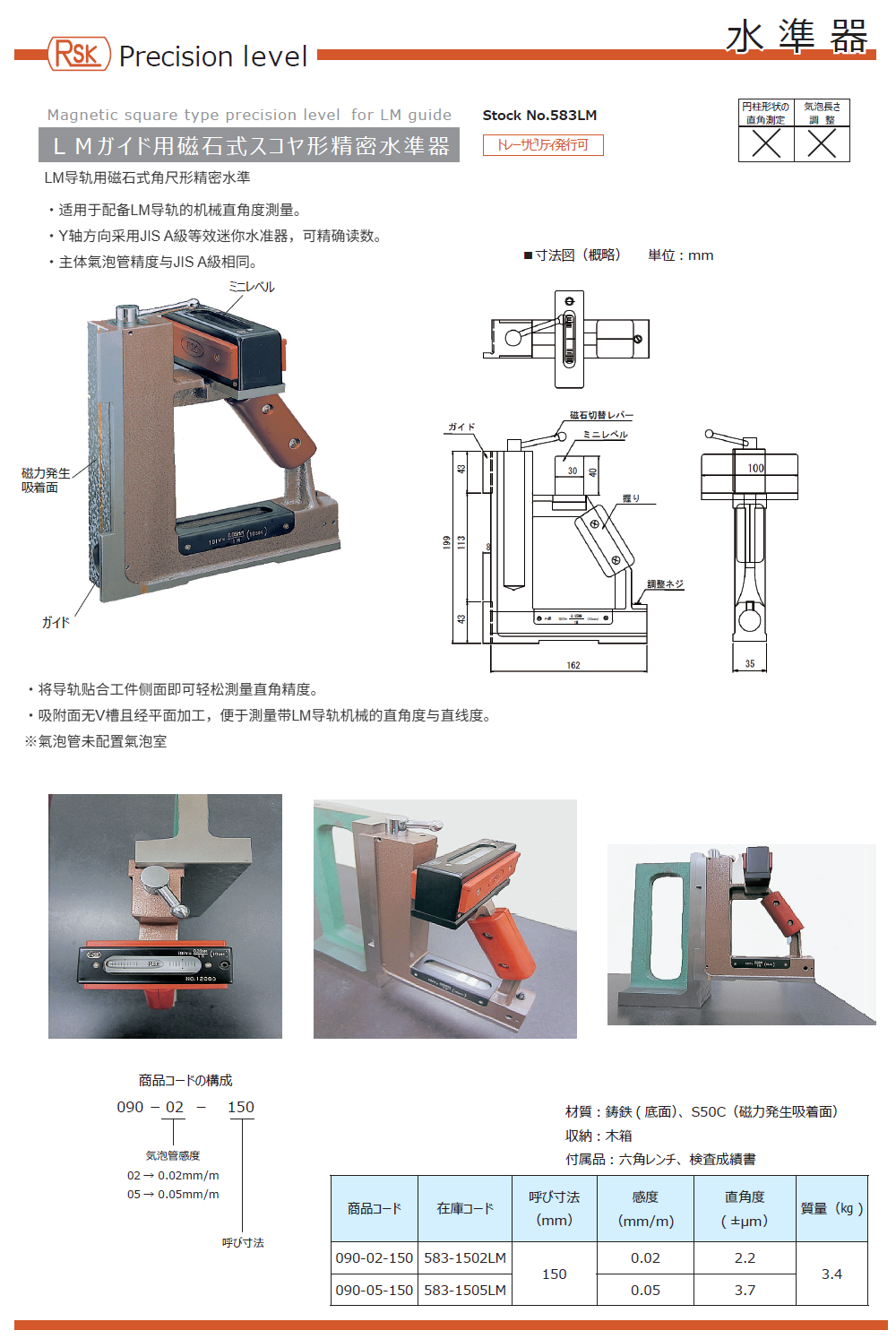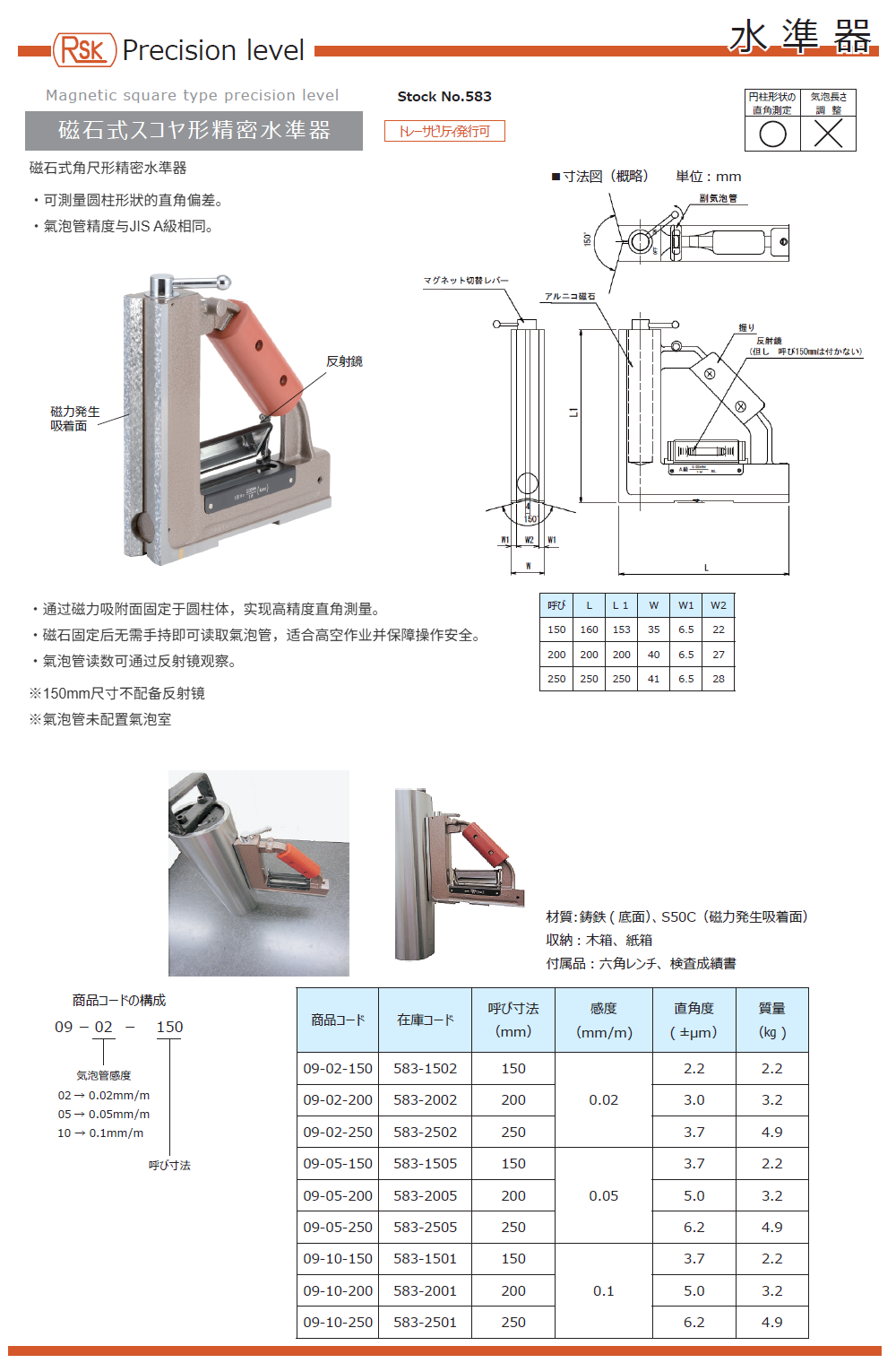 新泻理研RSK精密磁性水平仪150*150*0.02mm/m磁吸式垂直度水平仪250*250mm磁性直角度水平仪