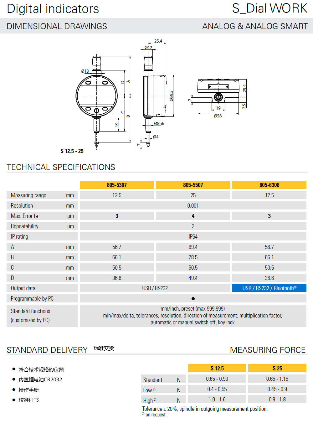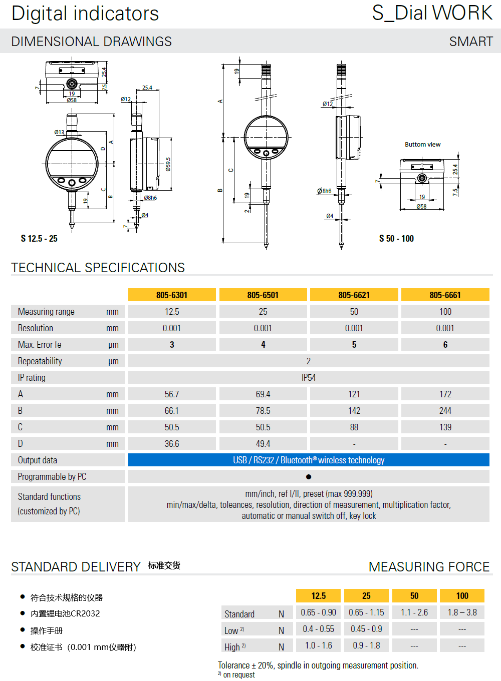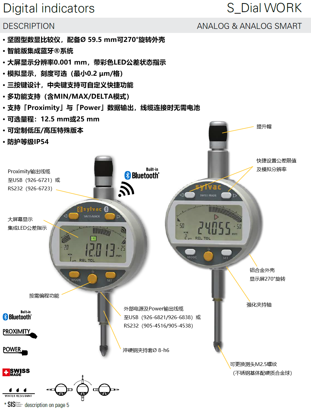 瑞士sylvac无线数显千分表0-12.5-25-50-100*0.001mm蓝牙无线千分表S_Dial WORK高精模拟式Bluetooth千分表
