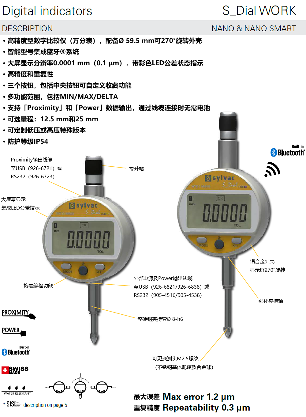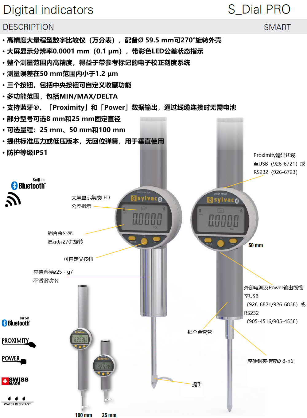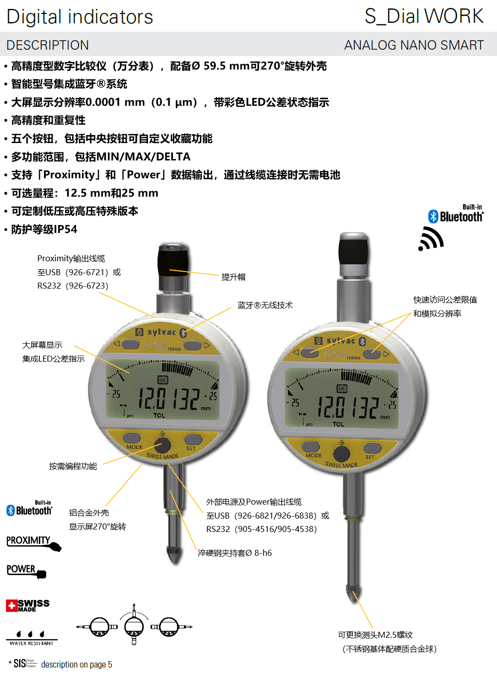 瑞士sylvac蓝牙数显万分表S_Dial WORK高精度0.0001mm无线数显千分表0-100mm精度0.1μm蓝牙Bluetooth数据传输