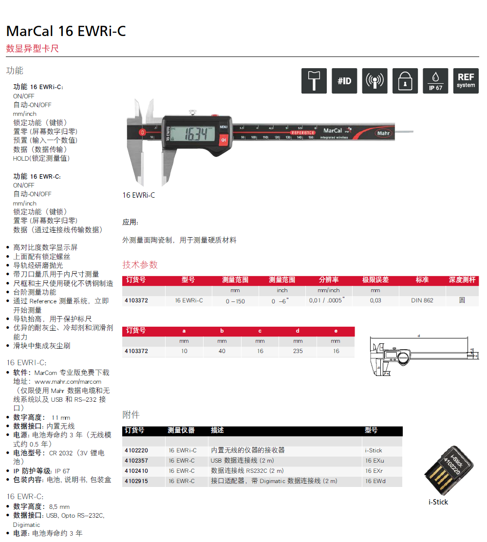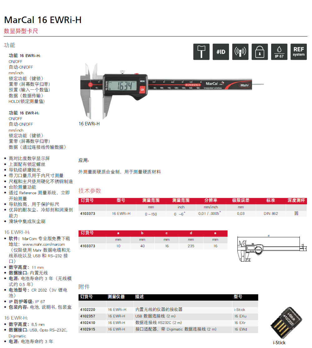 德国MAHR马尔MarCal 16 EWRi-C内置无线陶瓷爪数显卡尺MarCal 16 EWRi-H钨钢爪蓝牙数显卡尺刀具钻头数显卡尺
