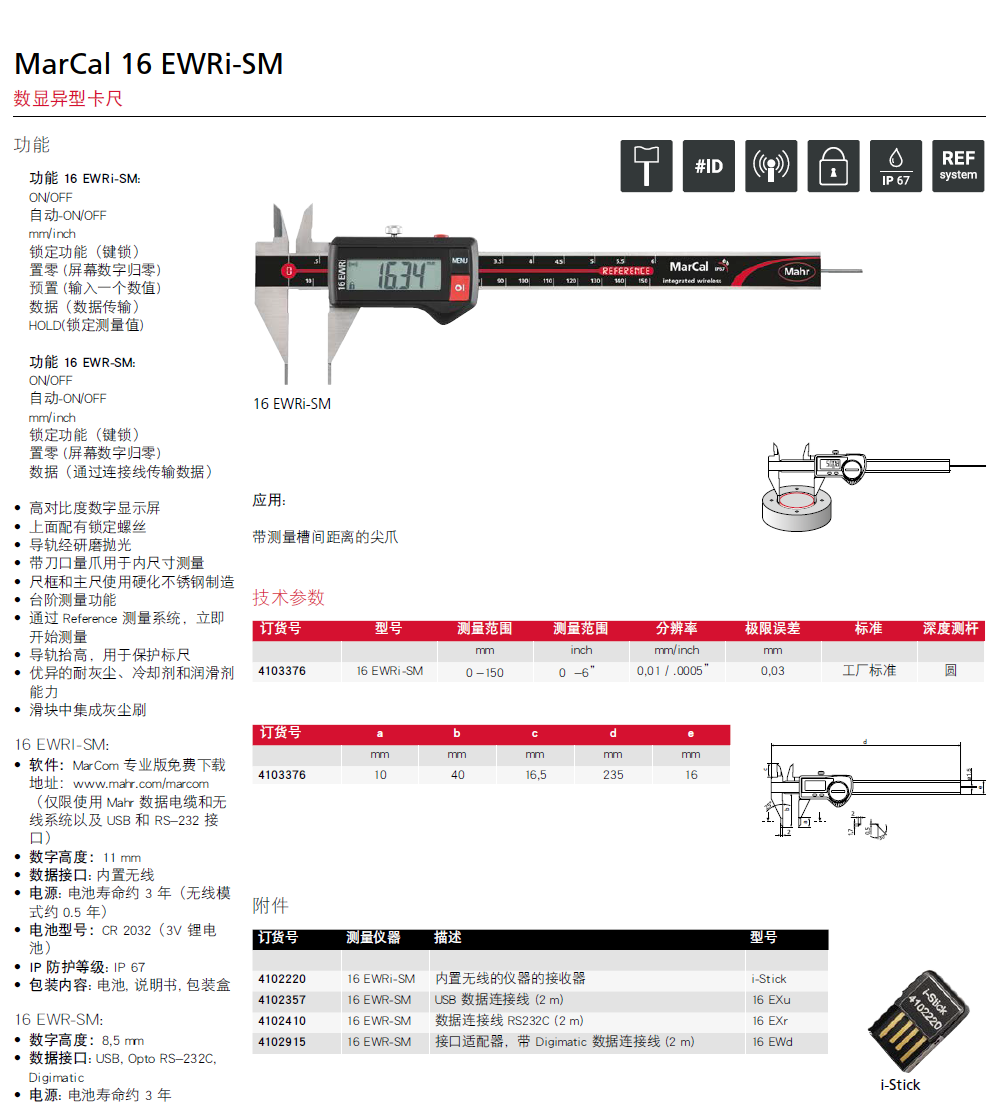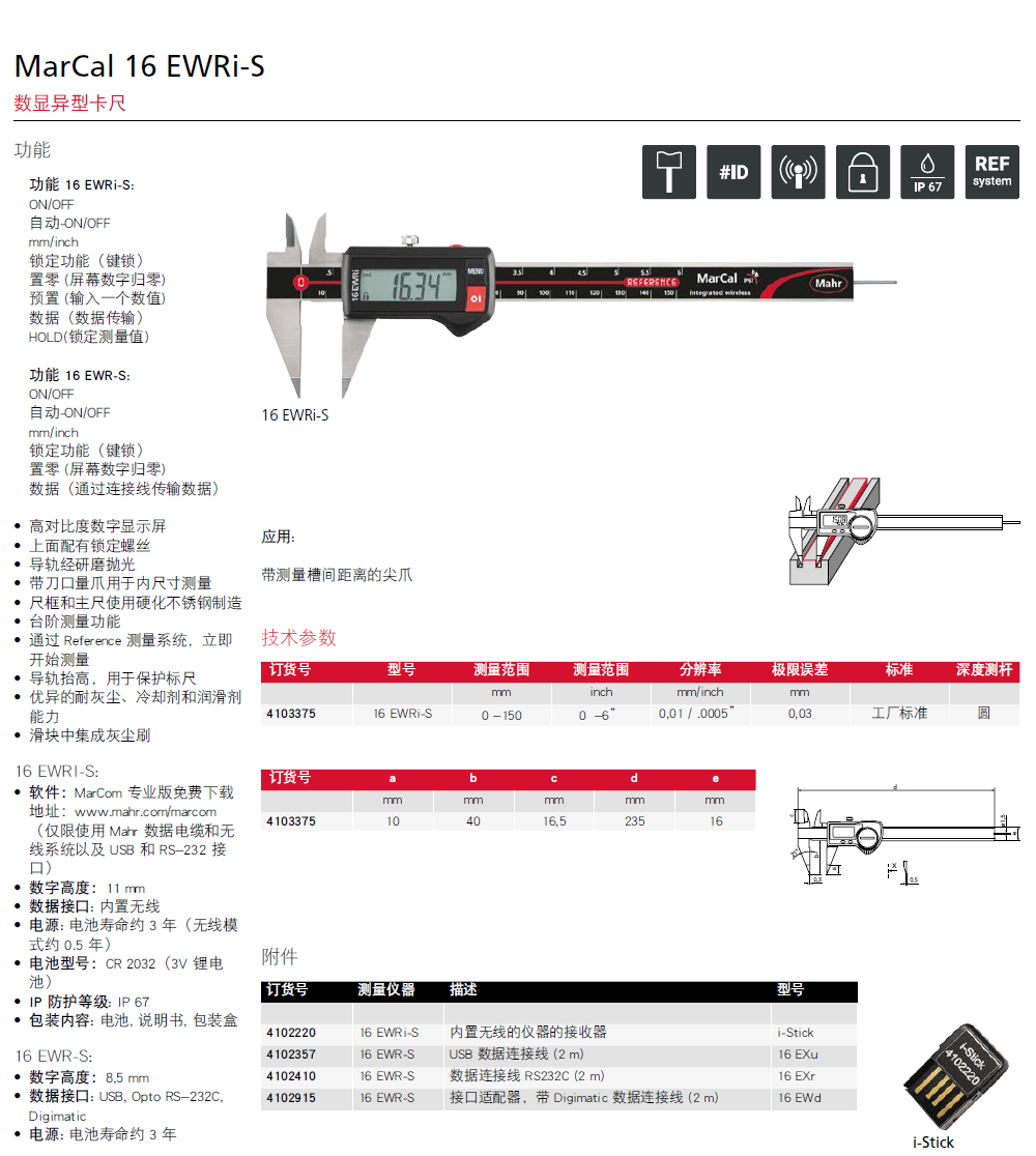 MAHR马尔MarCal 16 EWRi-S尖爪无线数显卡尺无线蓝牙键槽宽度数显卡尺MarCal 16 EWRi-SM德国原装