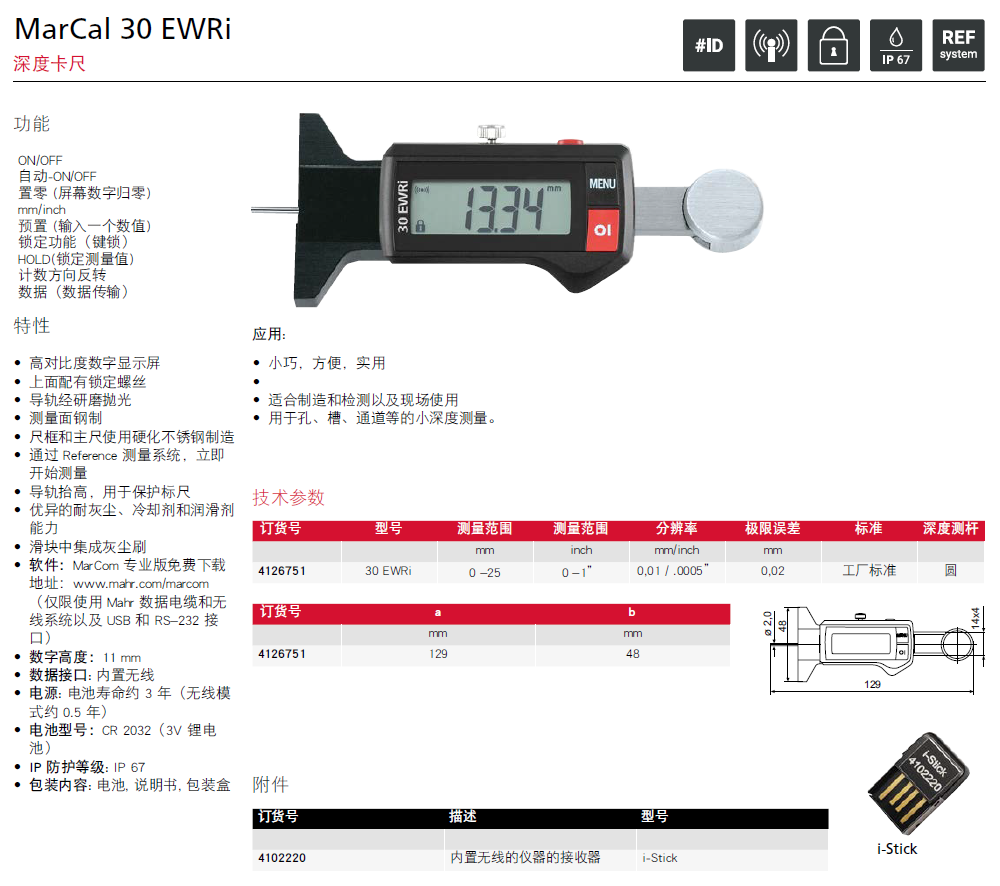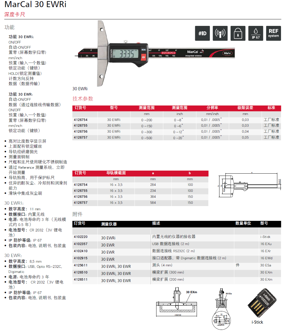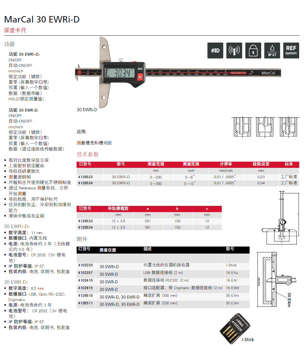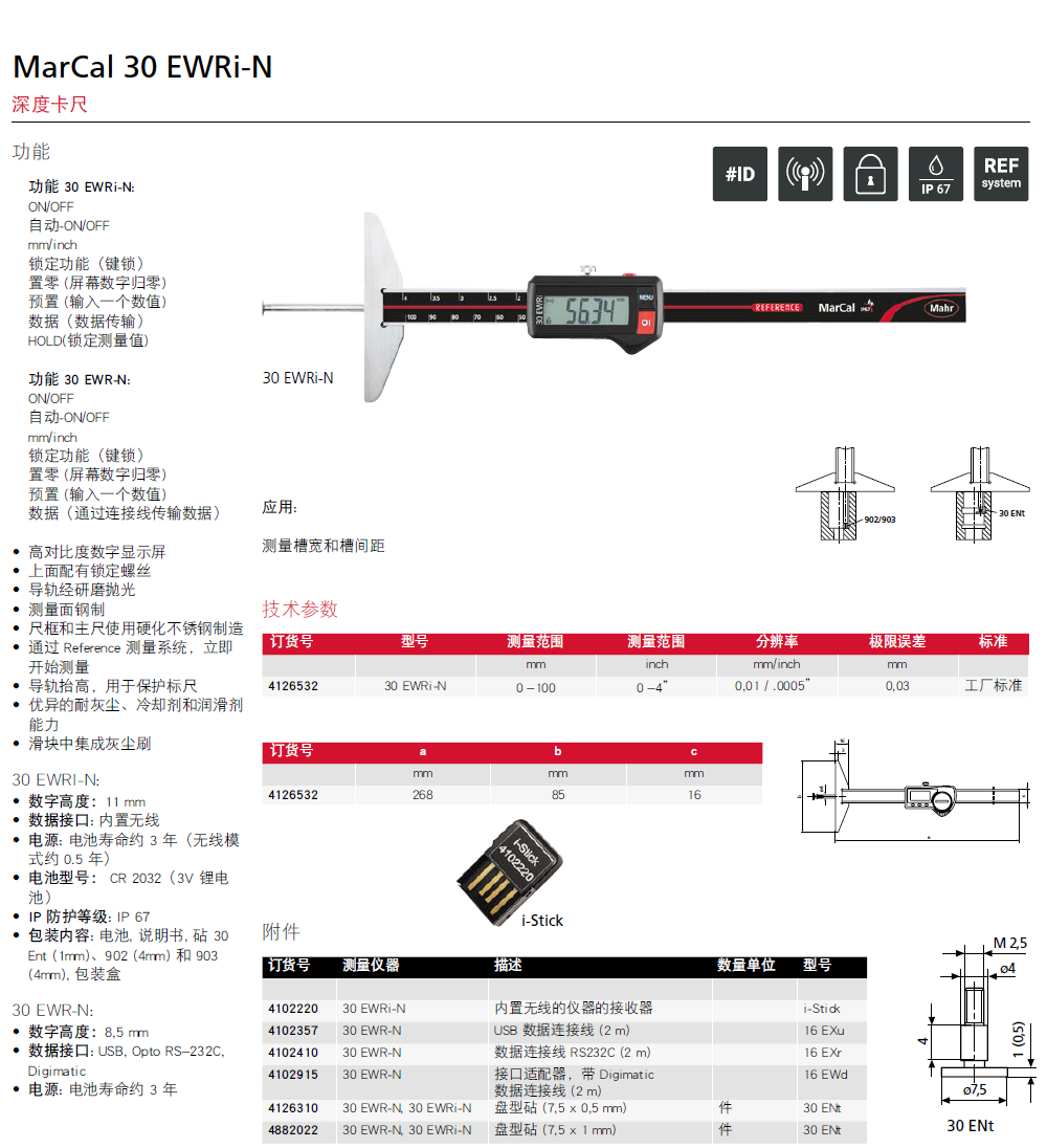 德国MAHR马尔无线数显深度卡尺MarCal 30 EWRi无线蓝牙数显深度尺MarCal 30 EWRi-N带钩深度计MarCal 30 EWRi-D轮胎花纹深度尺