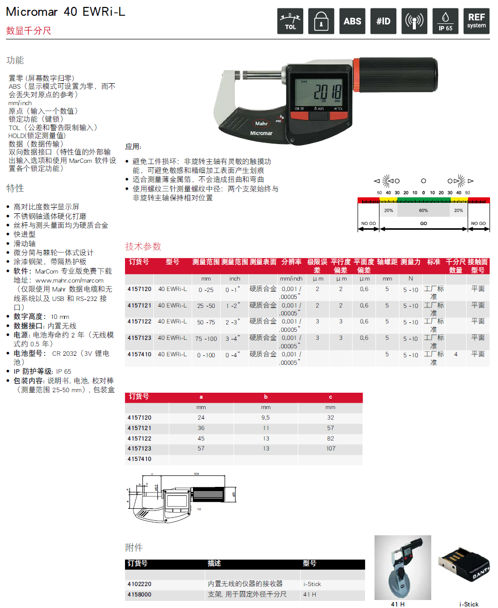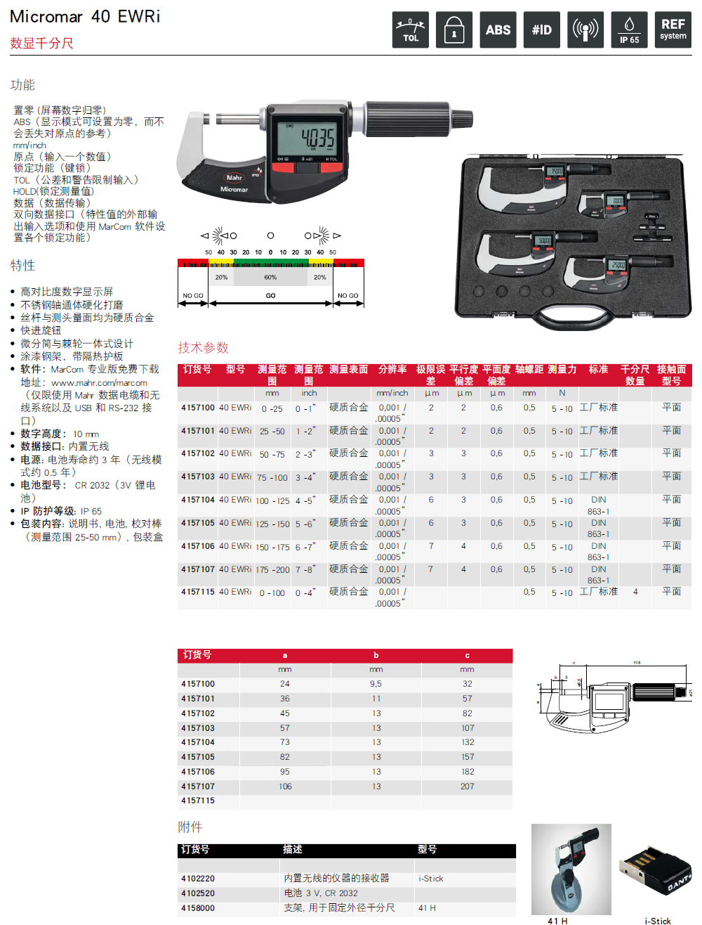 德国MAHR马尔内置无线数显千分尺Micromar 40 EWRi无线蓝牙数显外径千分尺Micromar 40 EWRi-L直进式非旋转分厘卡