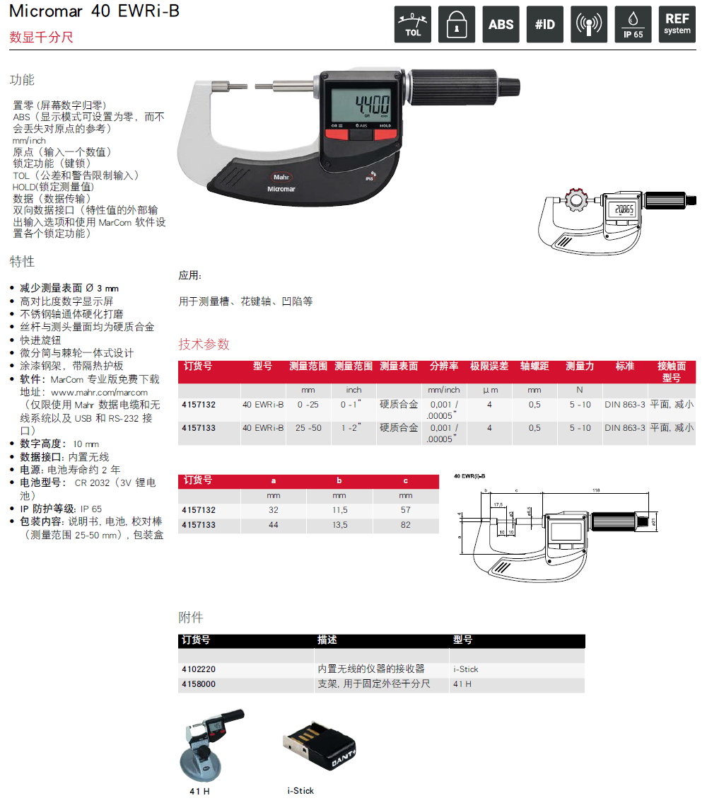 马尔MAHR无线花键千分尺Micromar 40 EWRi-B无线蓝牙花键轴数显千分尺小头小直径外径千分尺