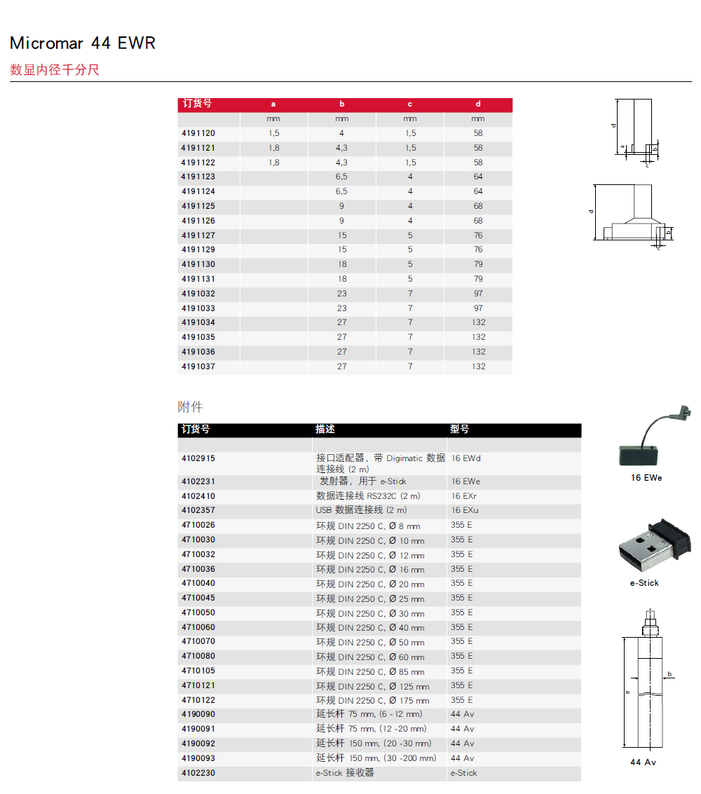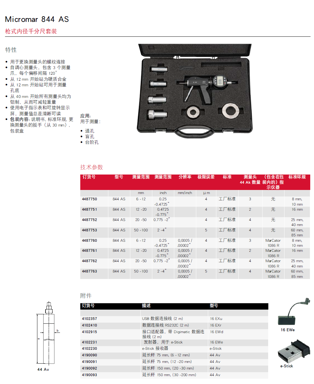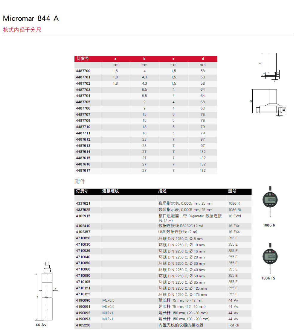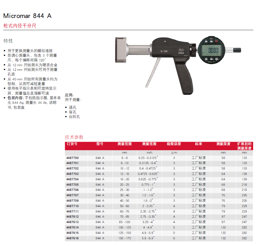 Micromar 844 A快速枪式内径千分尺,搭配无线输出量表或选配16 EWe无线发射器,可实现无线数据传输功能。