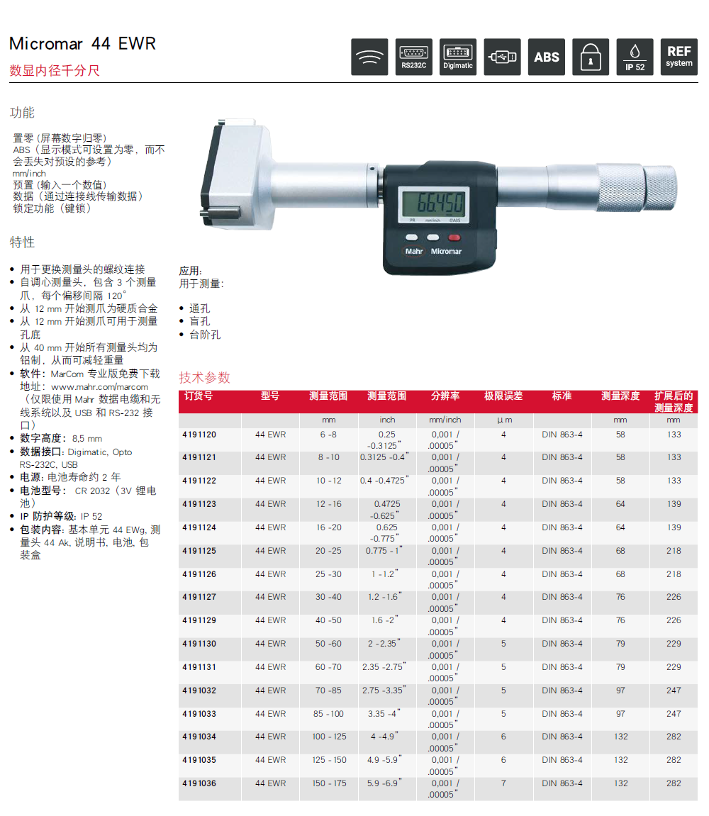 德国MAHR马尔无线数显三点内径千分尺Micromar 844 A无线蓝牙快速三爪孔径千分尺Micromar 44 EWR数显内径千分尺